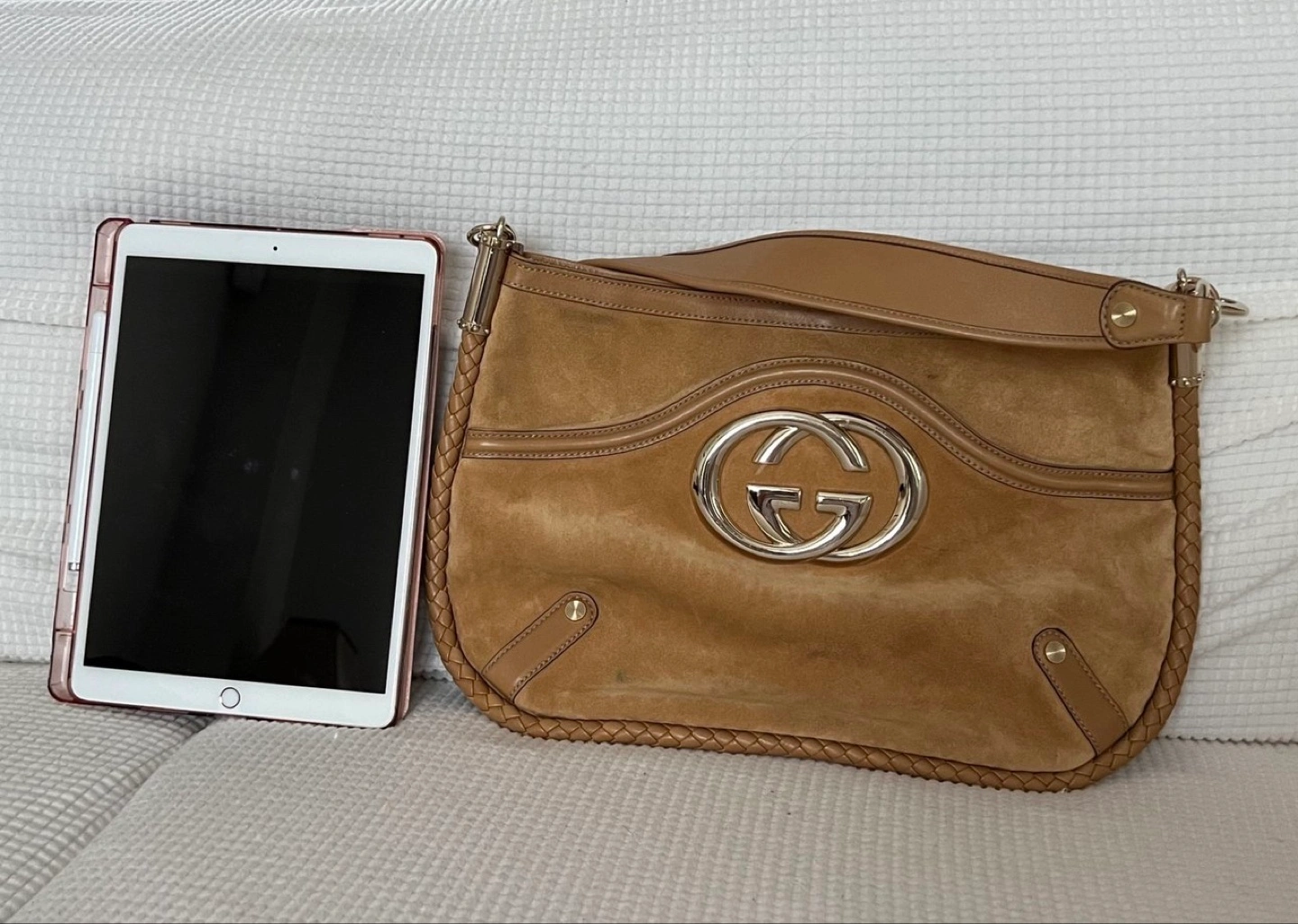 Tan suede hobo bag. Features a large interlocking GG logo. Braided detailing. Leather accents. Comes with original dust bag. A rate find.