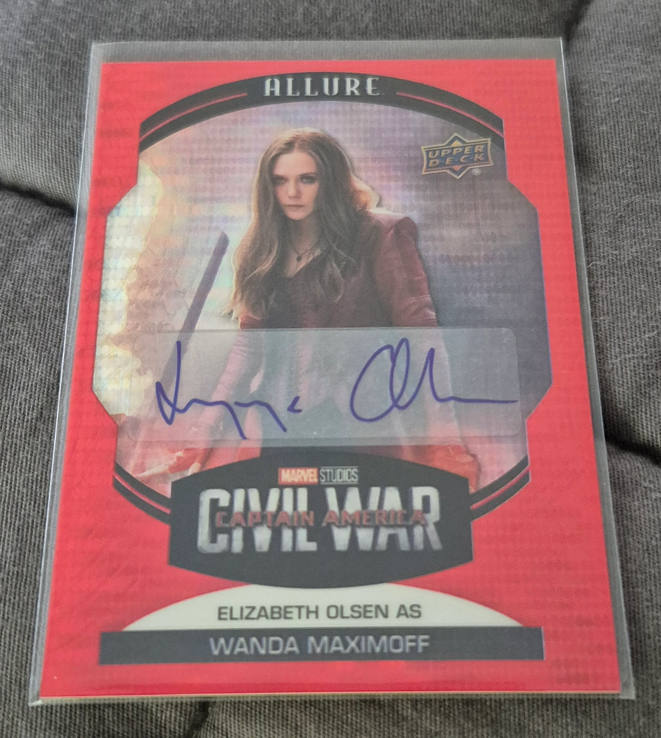 Autographed trading card featuring Elizabeth Olsen as Wanda Maximoff from Captain America: Civil War. Red autographed card. Part of the Upper Deck Allure Infinity Saga collection. Numbered 51. I also have other inserts and base cards from the set if interested.