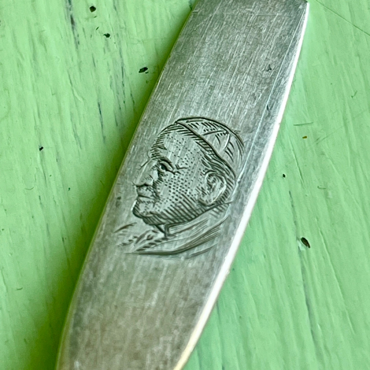 This is a vintage Oneida LTD. Silver Plated Souvenir Spoon featuring a portrait of Pope John XXIII. Pick up Montgomery. Cross-posted.