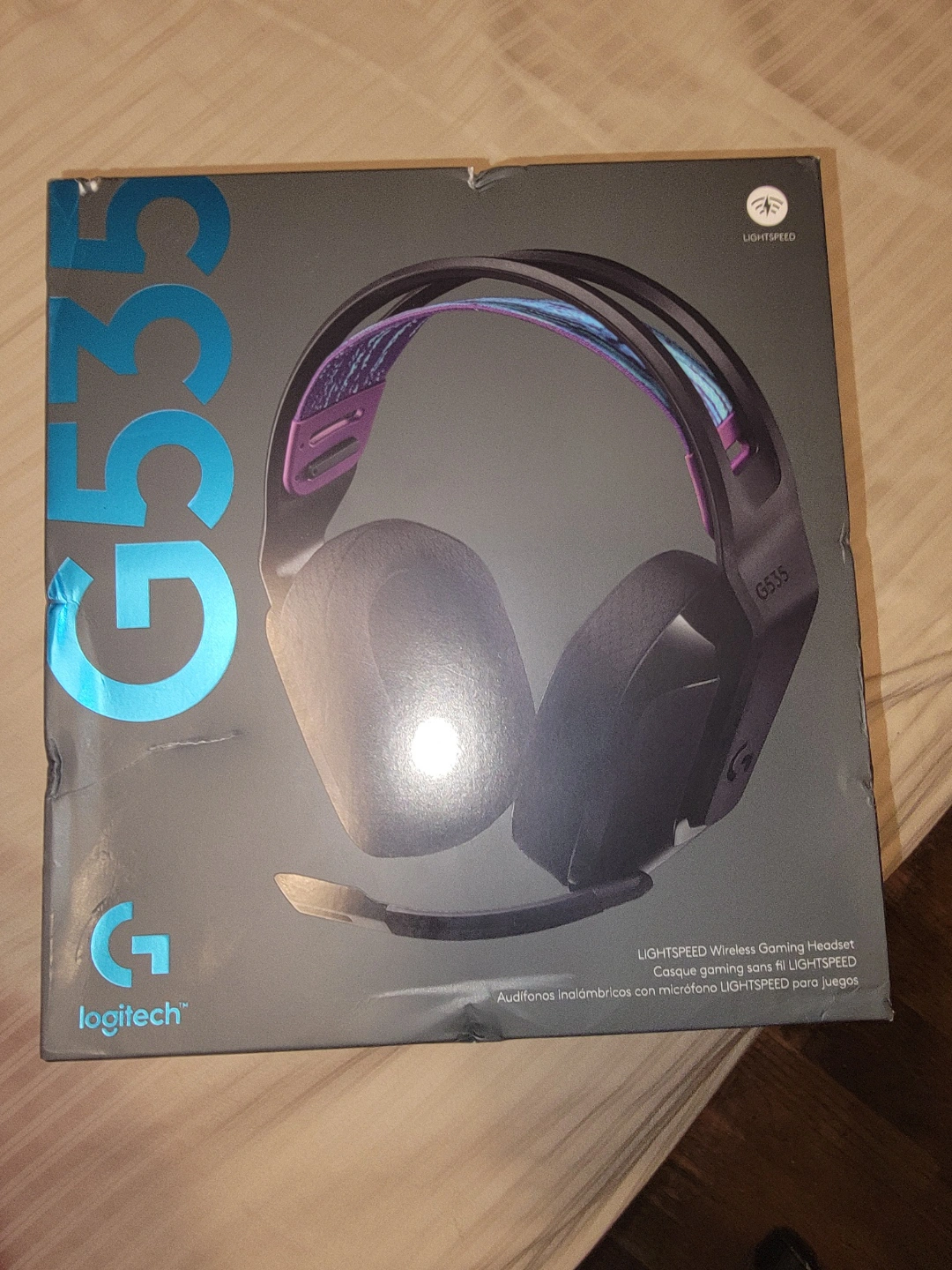Logitech G535 wireless gaming headset. New in box, Lightspeed wireless technology. Features a purple and teal headband.