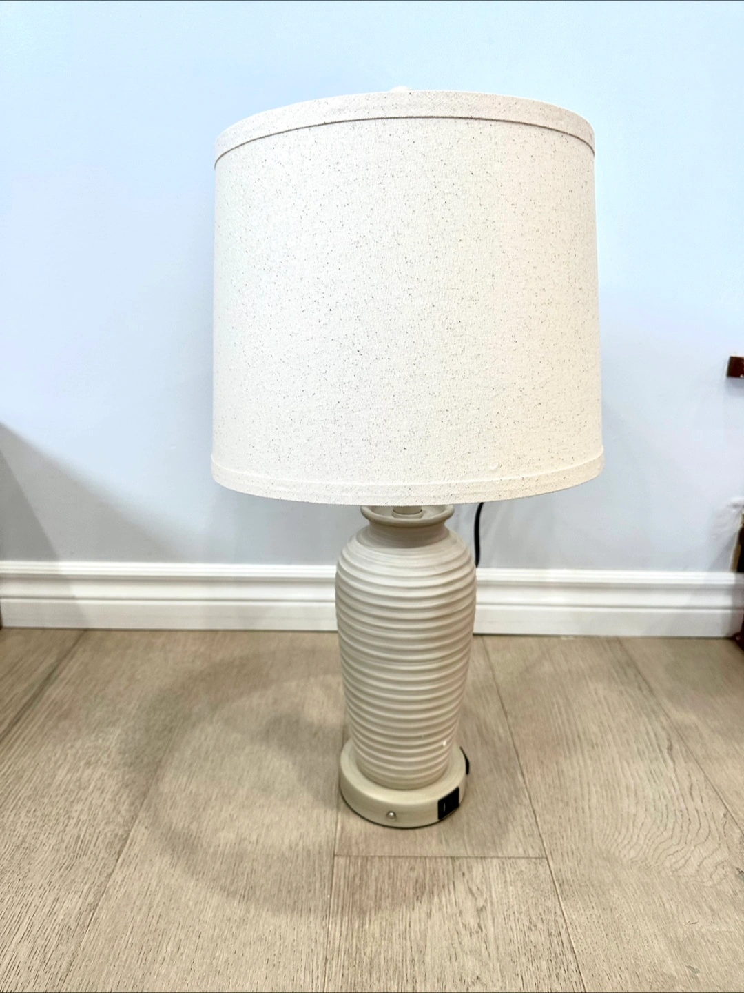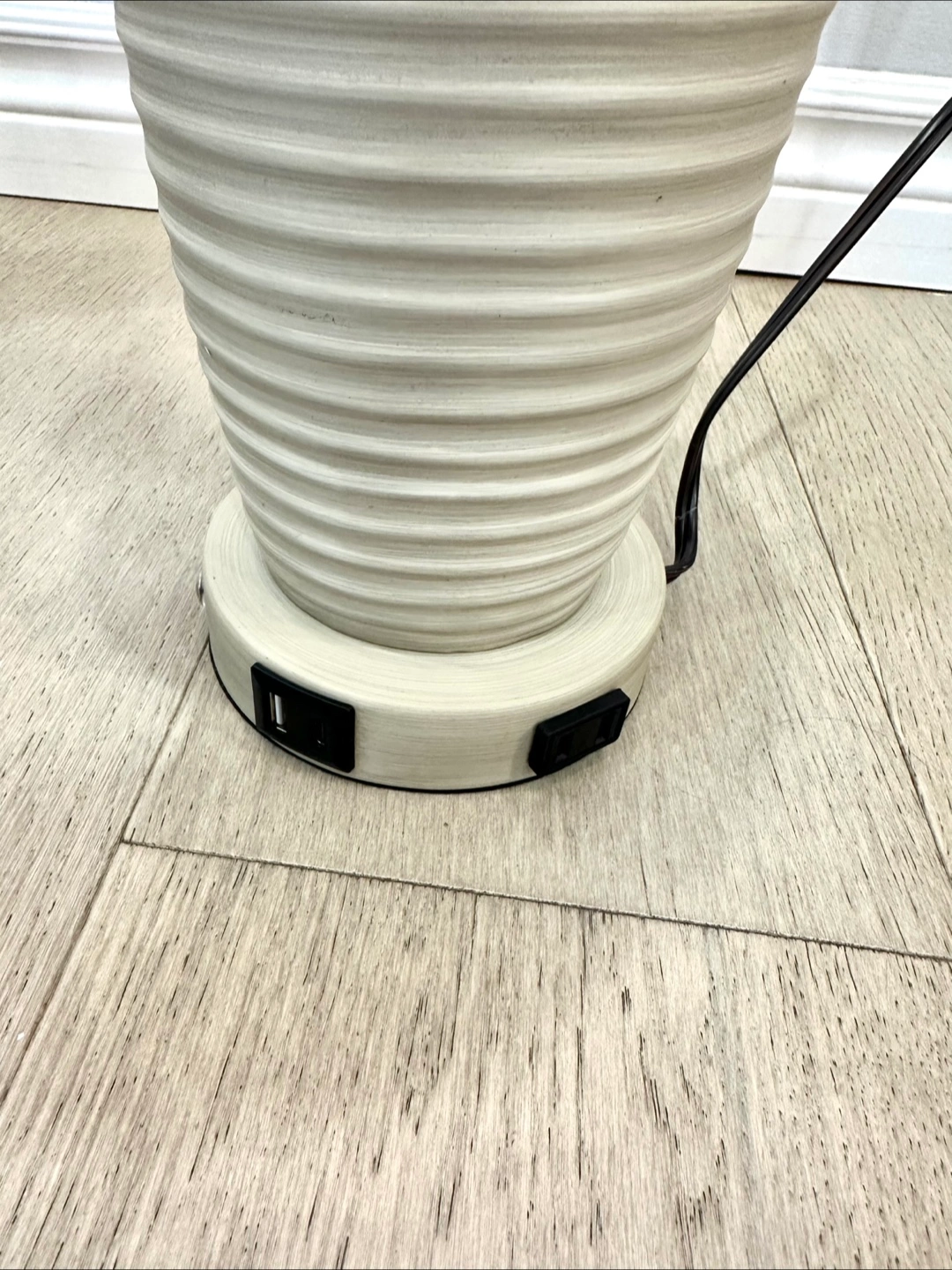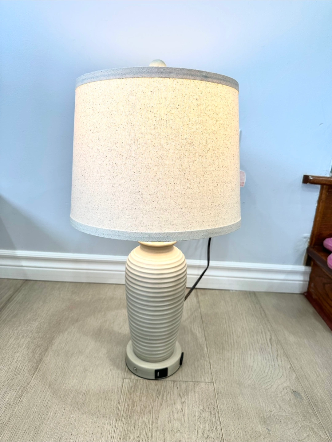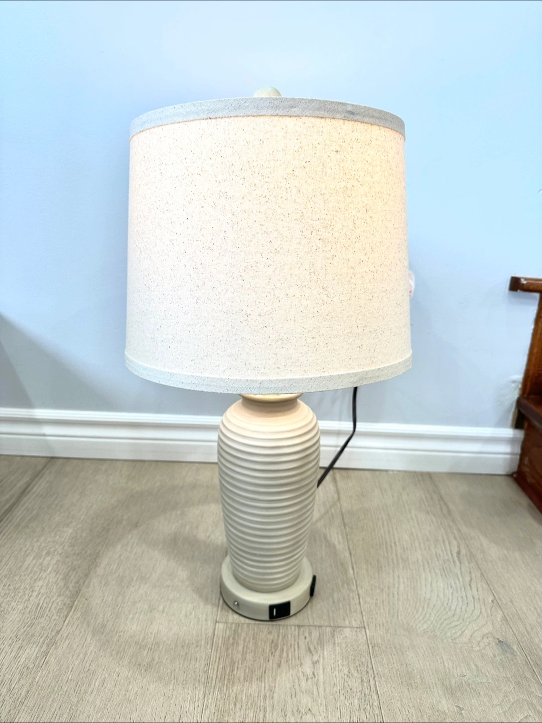 Cream coloured table lamp. Features a ribbed ceramic base and a beige fabric shade. Three-way dimmable with touch sensor. Includes built-in power outlet.