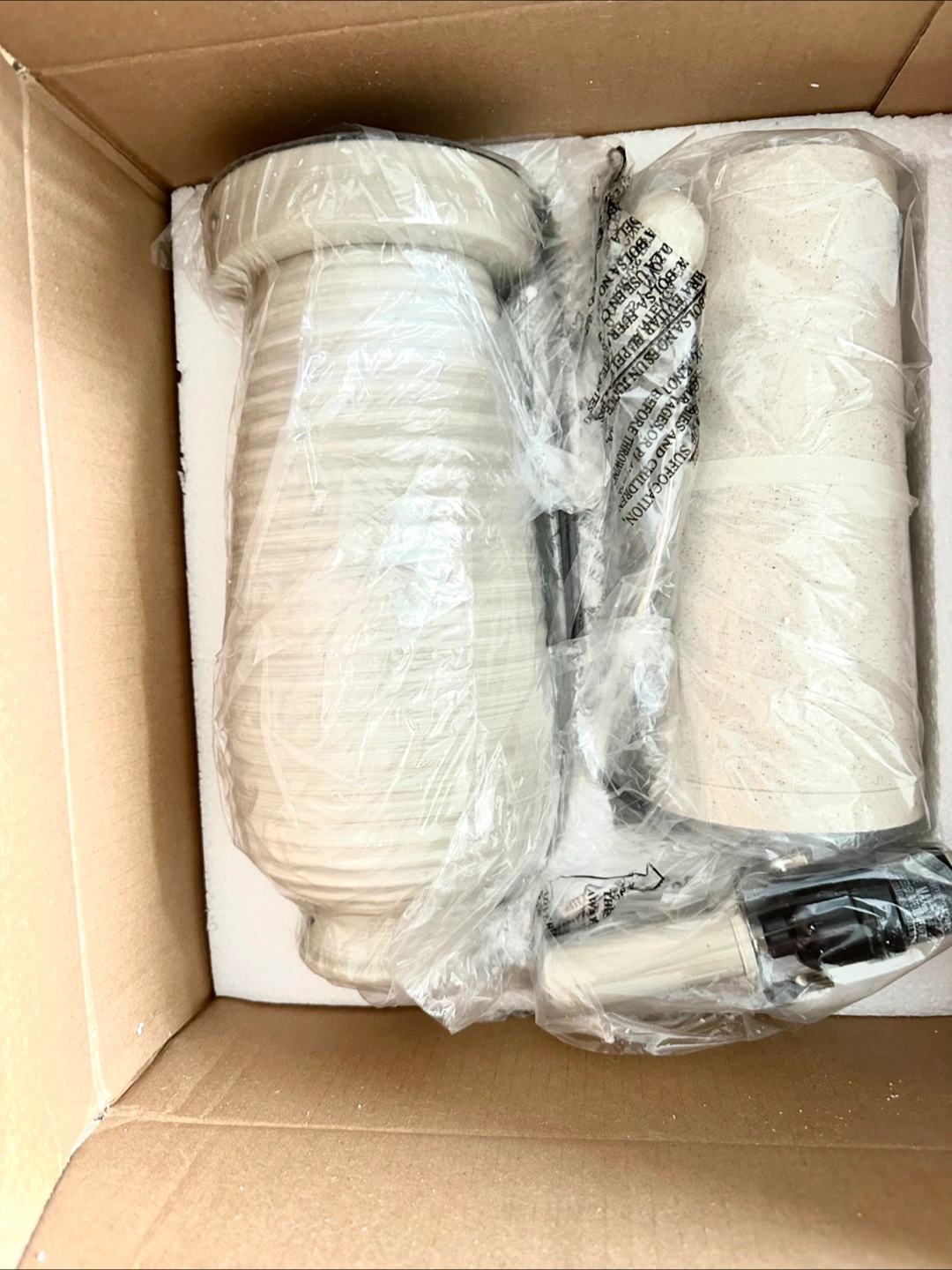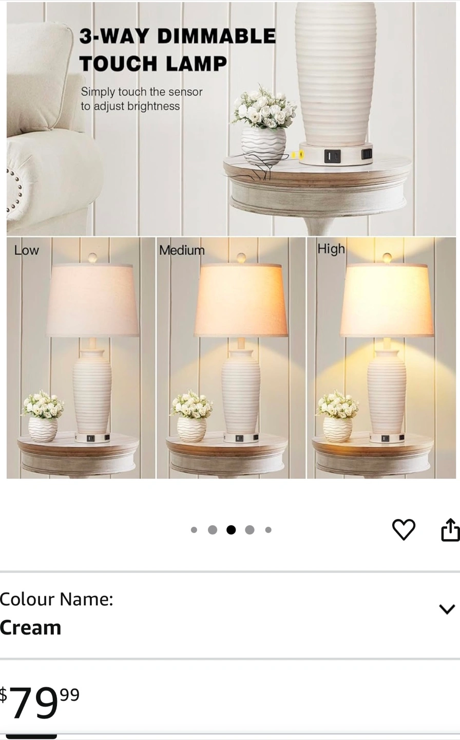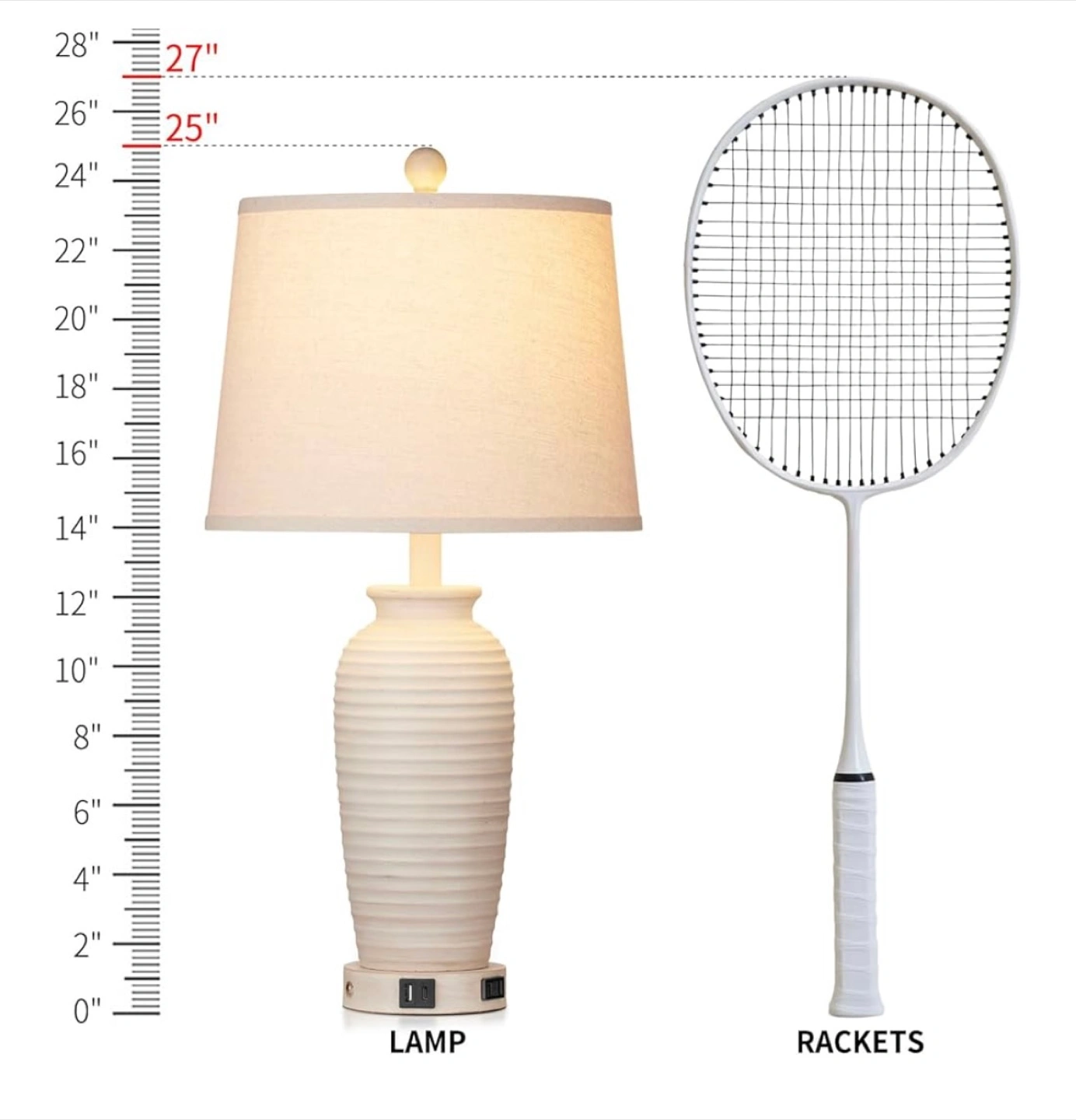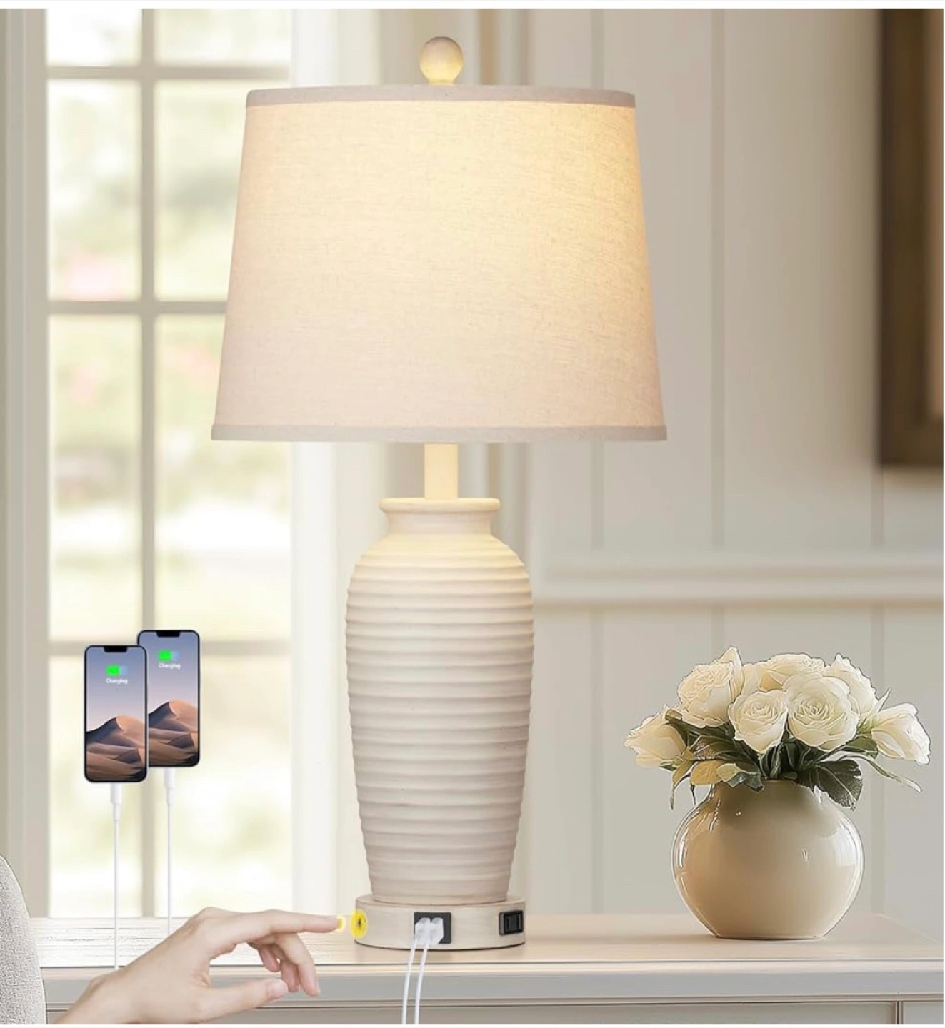 Cream coloured table lamp. Features a ribbed ceramic base and a beige fabric shade. Three-way dimmable with touch sensor. Includes built-in power outlet.