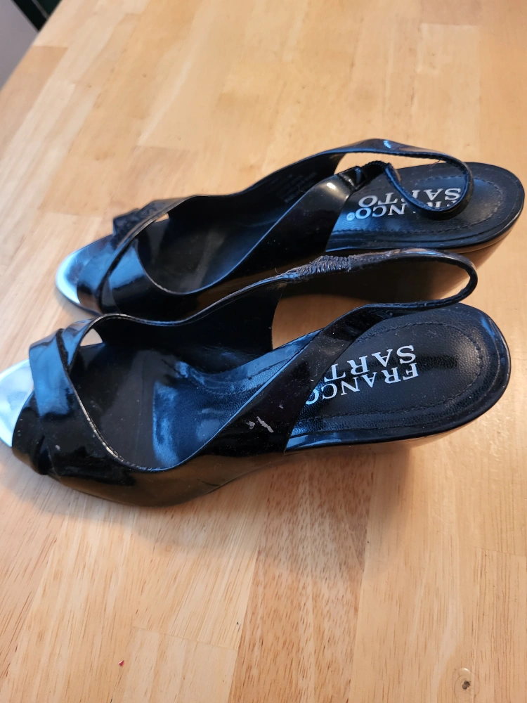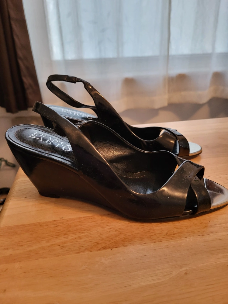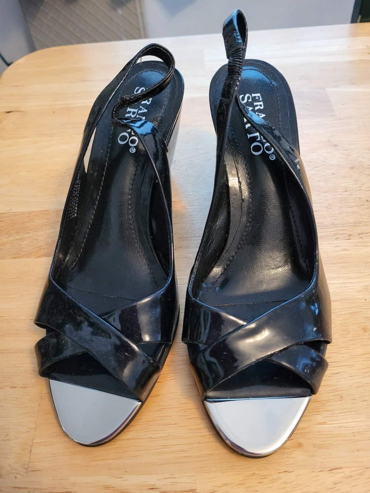 Women's black patent leather slingback wedges. Silver metallic accent at the toe. Low wedge heel. Size 6. Lightly used. small scratch on left shoe.