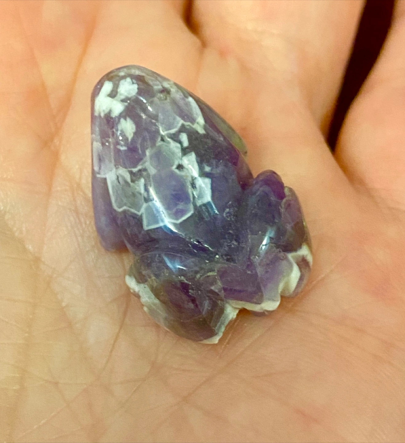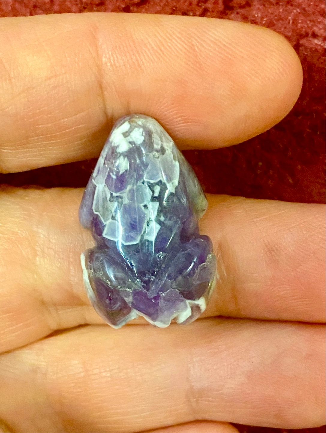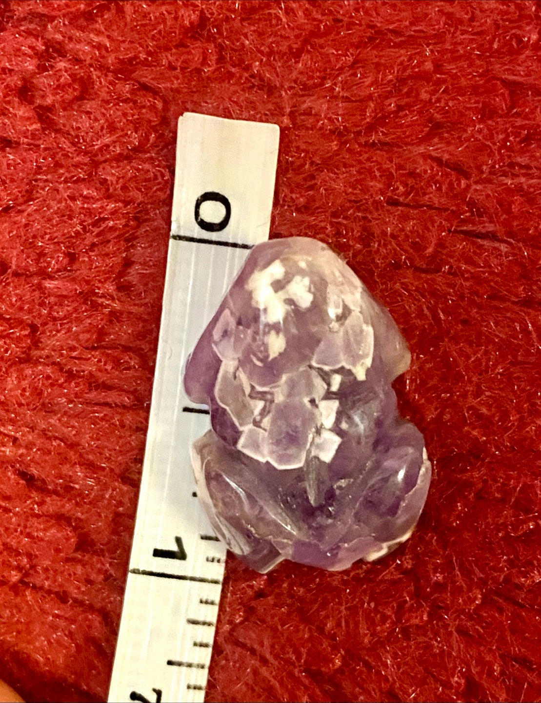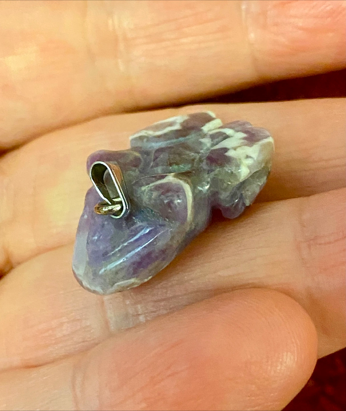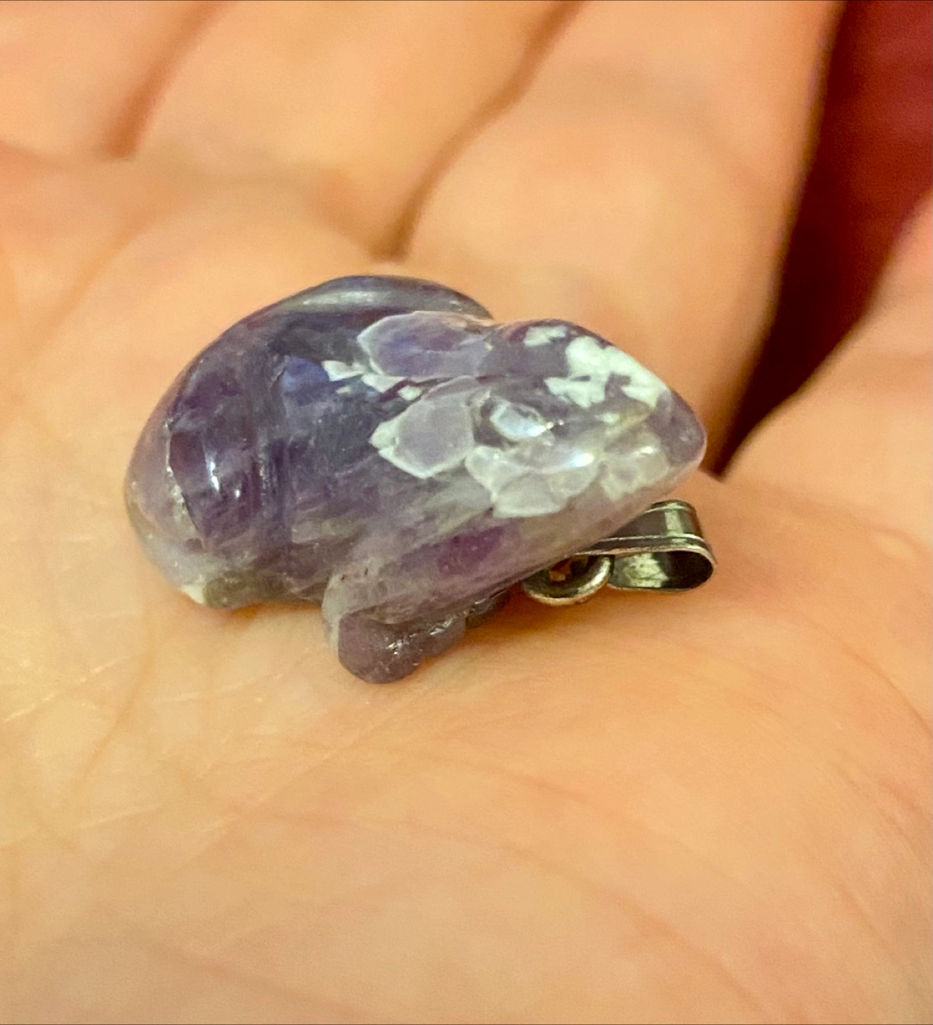 Small carved amethyst frog pendant. Purple and white coloring. Features a metal loop for hanging.