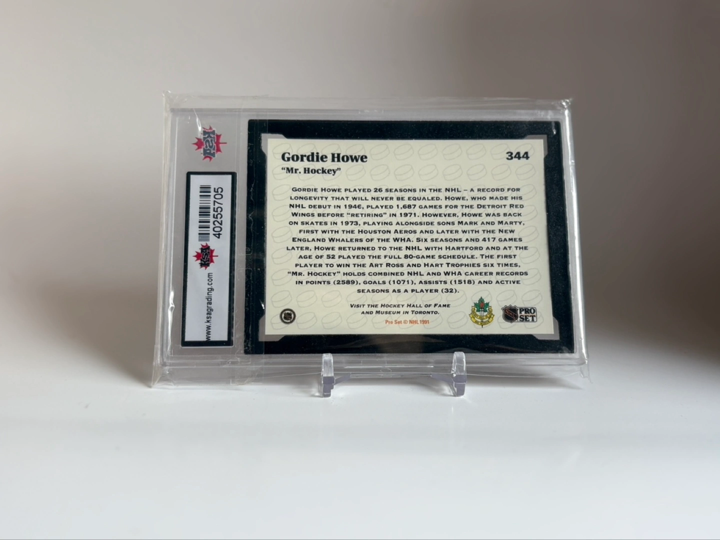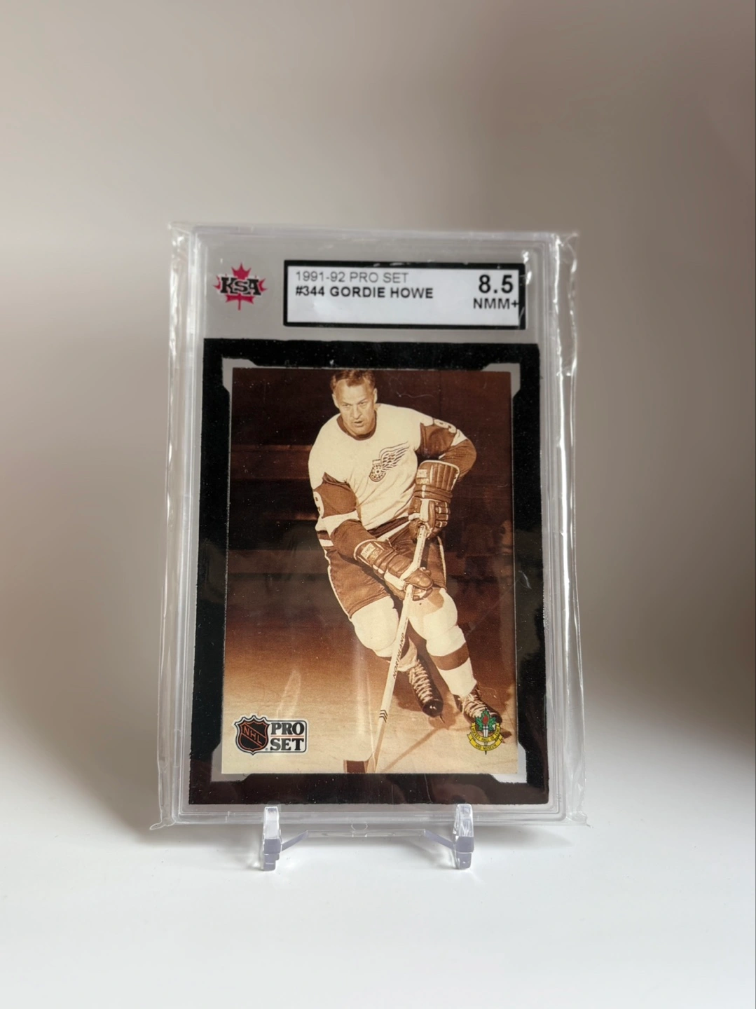Graded Gordie Howe hockey card. Part of the 1991-92 Pro Set series. Number 344. In a protective case. Excellent condition.