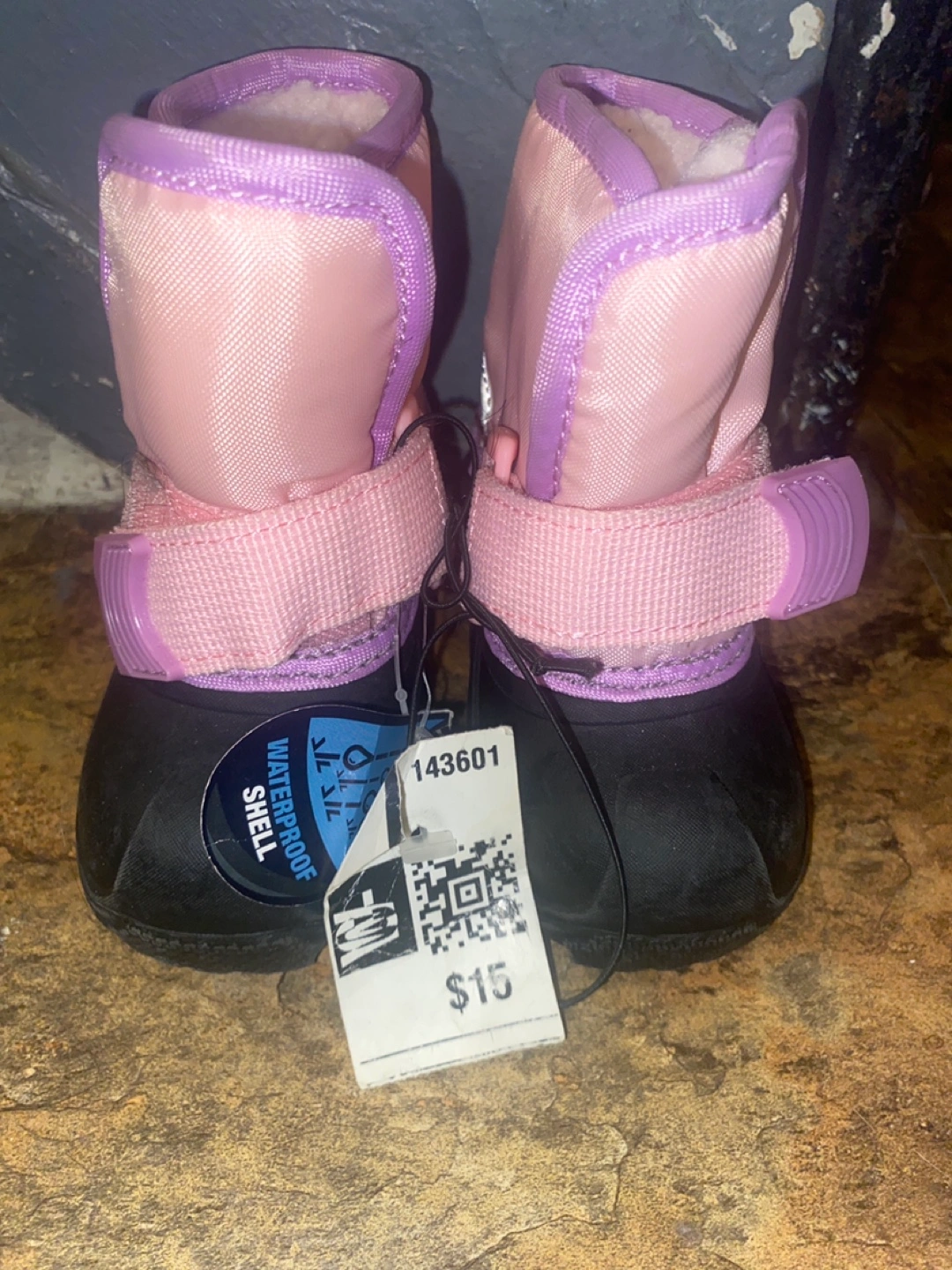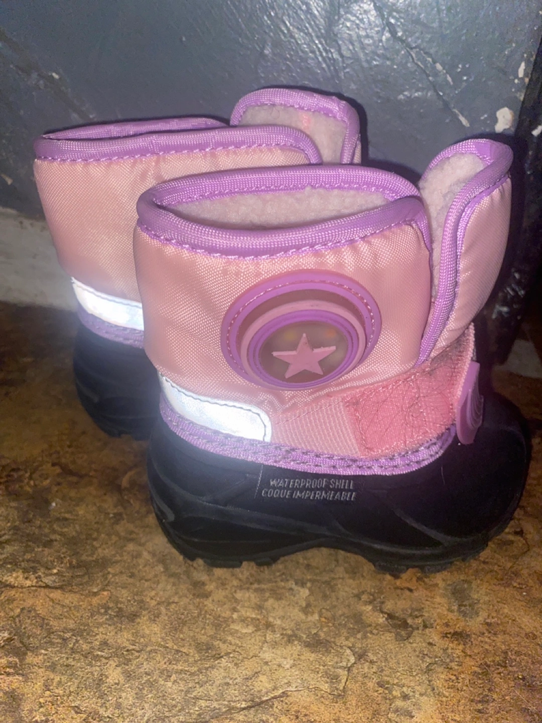 Adorable pink and purple toddler snow boots. Waterproof shell. Feature light-up star accents. Great for winter fun. Size 4 pick up location Royal and Mimico