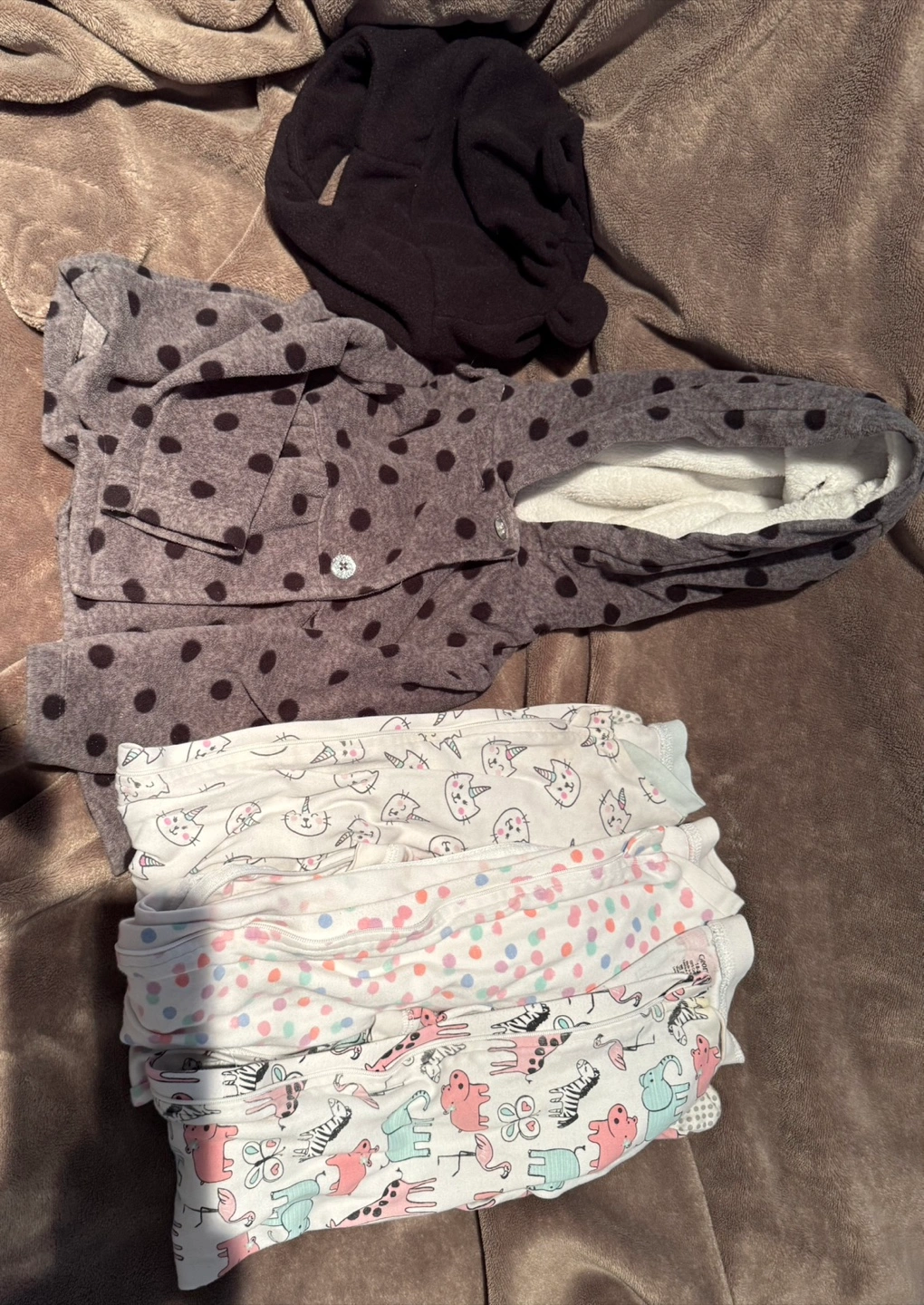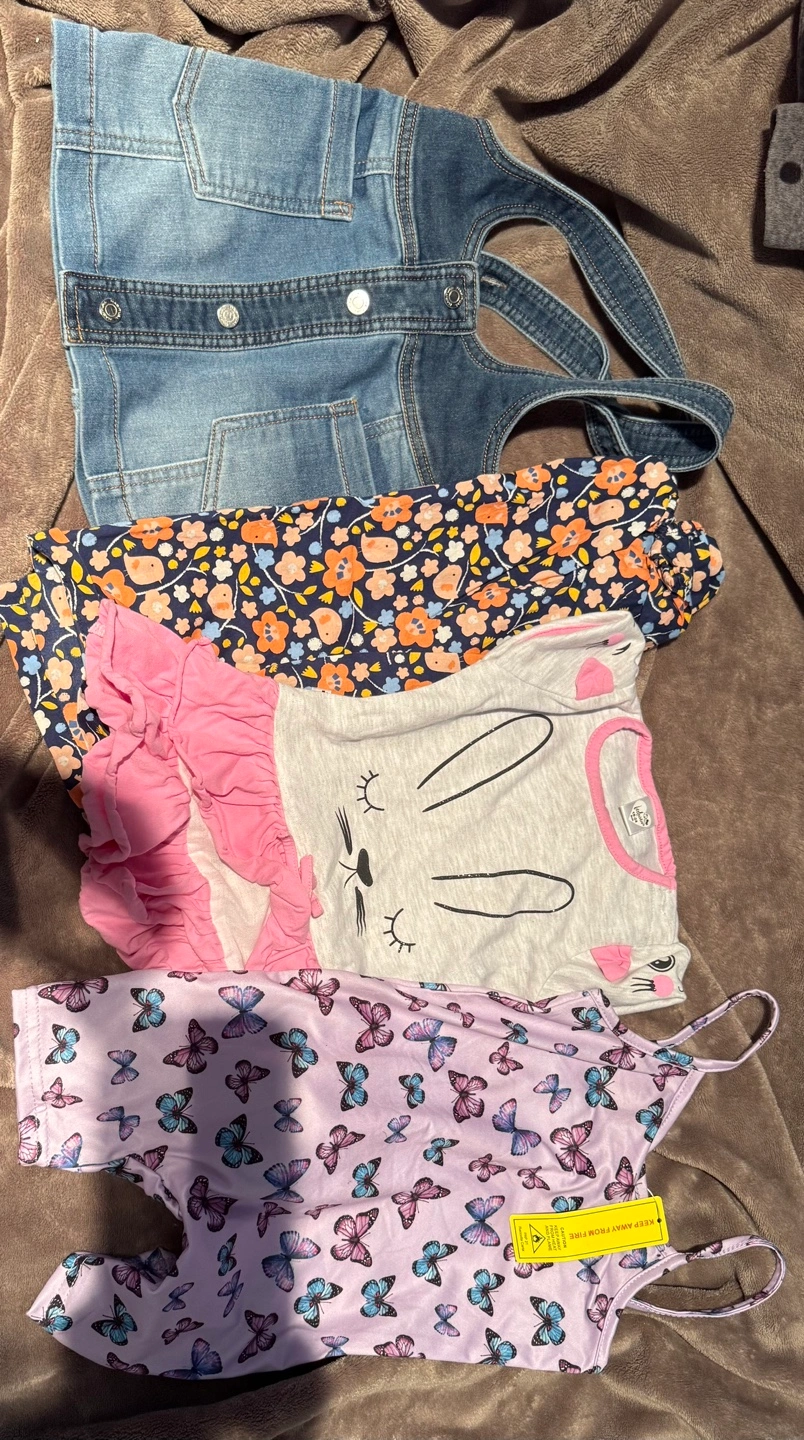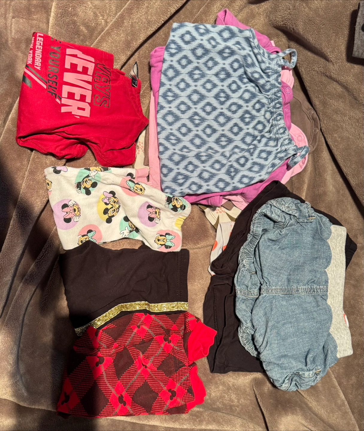 Sizing is 18 months and 18-24 months Including 5 short sleeve onesies 3 shorts 3 pants(1 is pjs) 1 tshirt 1 light coat 1 brand new winter hat 3 zipper sleepers(a few stains on neck) 2 dresses 1 brand new romper 1 denim overall skirt Total pieces is 21