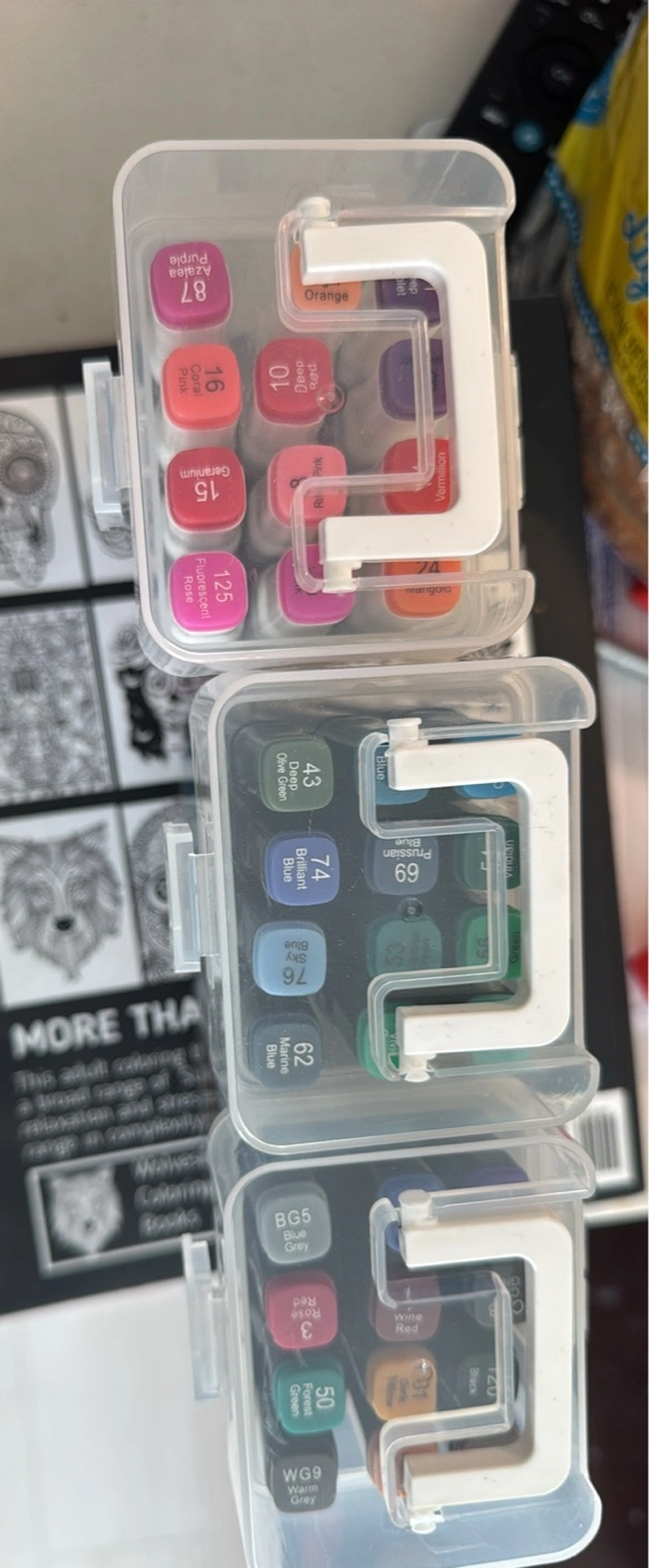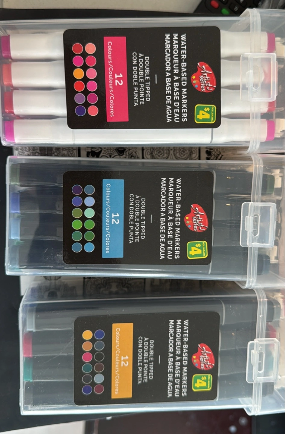 Three sets of twelve double-tipped water-based markers. Each set in a clear plastic storage case. Various colours in each set.