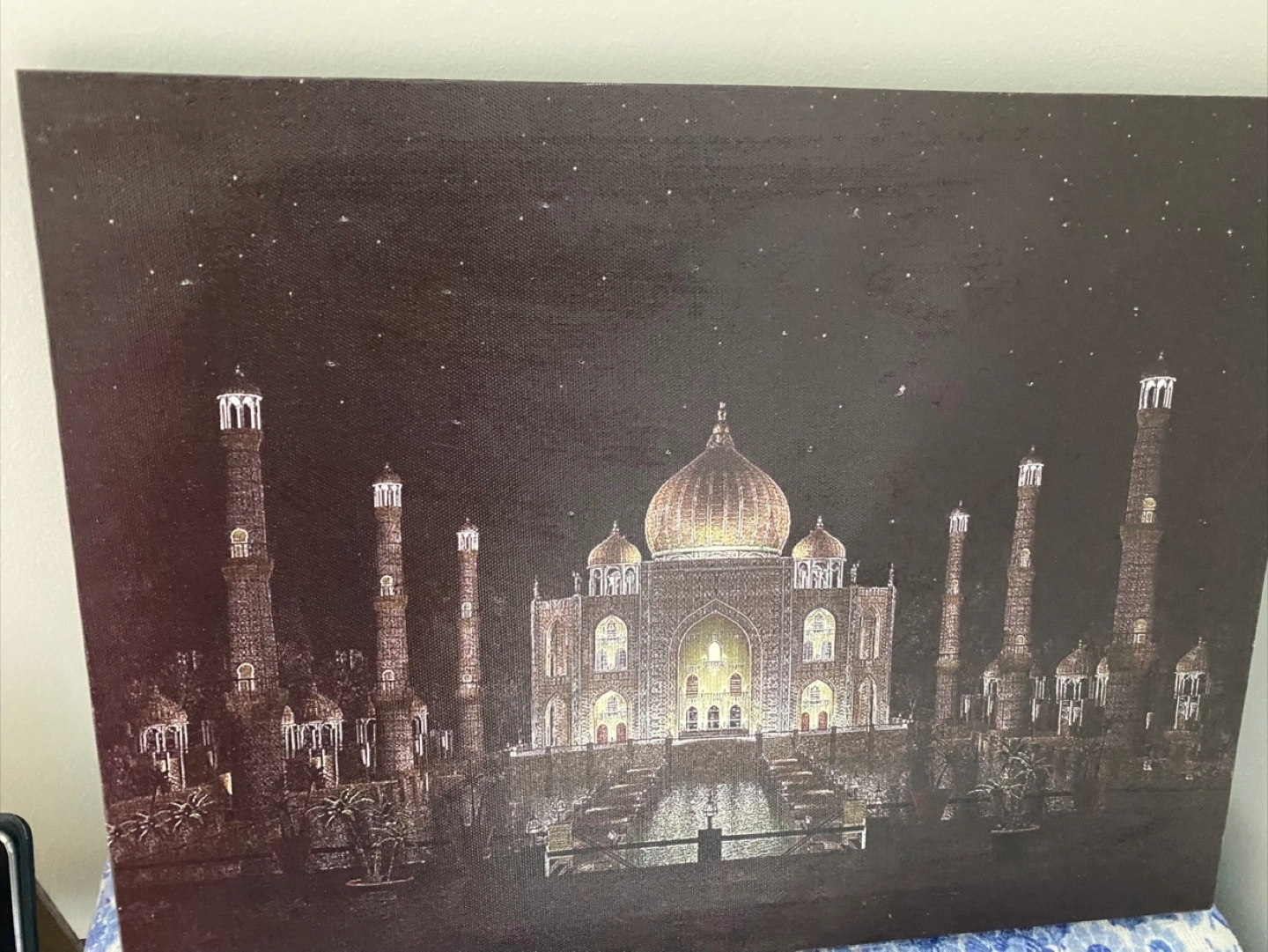 Stunning canvas print. Features the Taj Mahal at night. Glowing effect. Perfect for home decor. Cash only payment Request to check the product thoroughly before taking home.