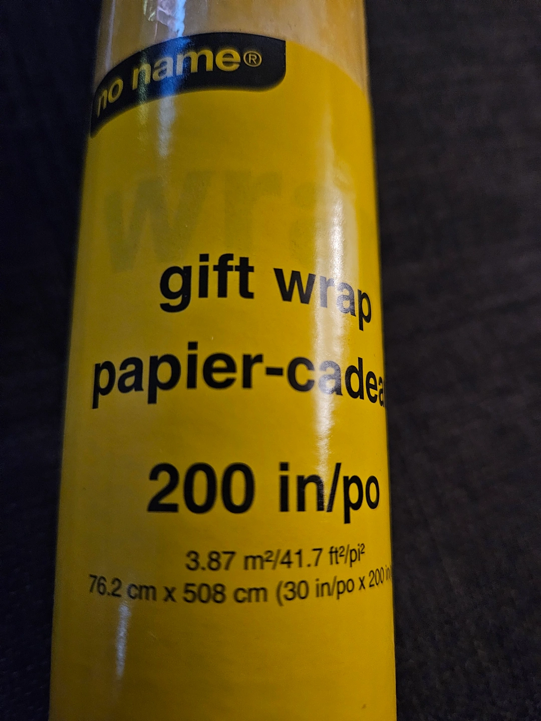 Roll of No Name Brand yellow gift wrap. 200 square inches. Great for presents. Sealed. Pickup at 38 Joe Shuster Way. See my other listings.