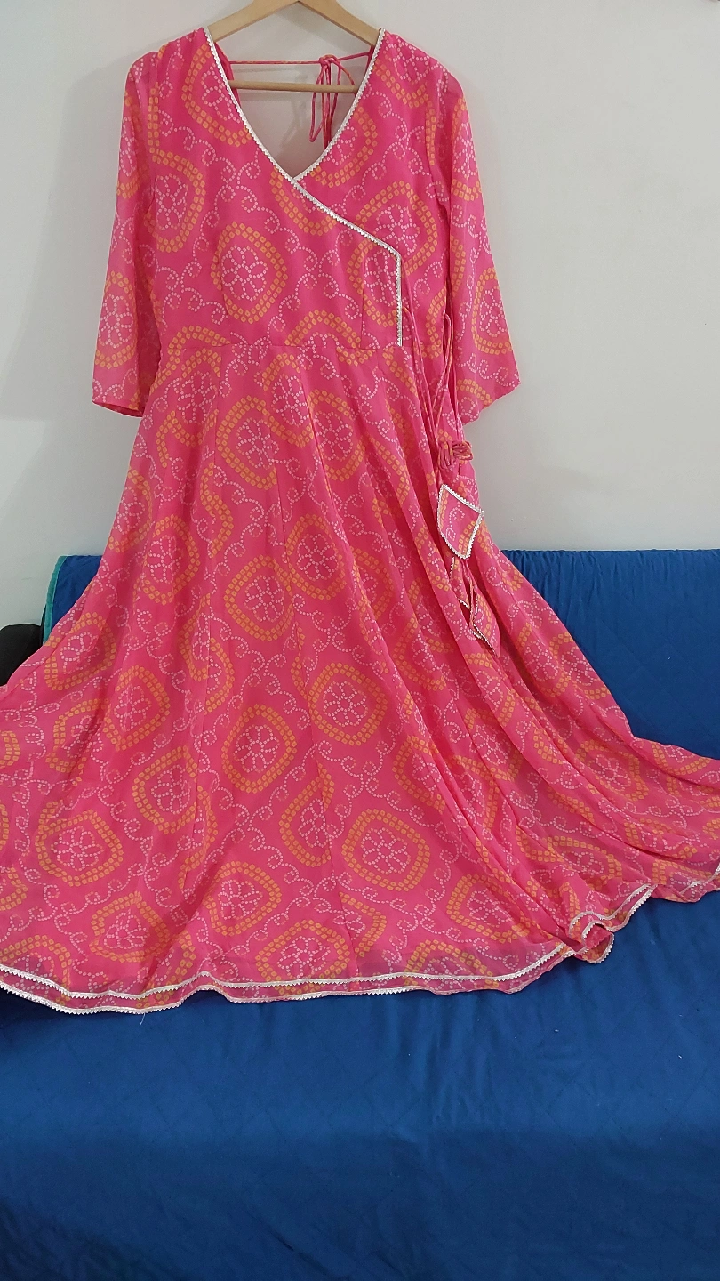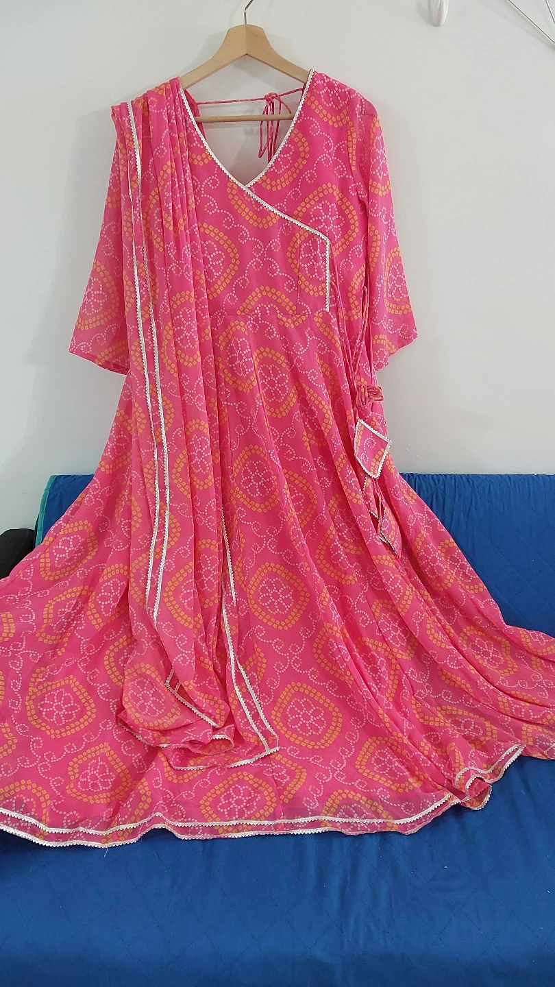 Beautiful pink Anarkali suit. Features a bandhani, three-quarter sleeves, and a V-neck. Comes with a matching dupatta. Elegant and comfortable. Smoke free and pet free home Kindly note all sales are final and no return or refund Please check my other listings aswell😊