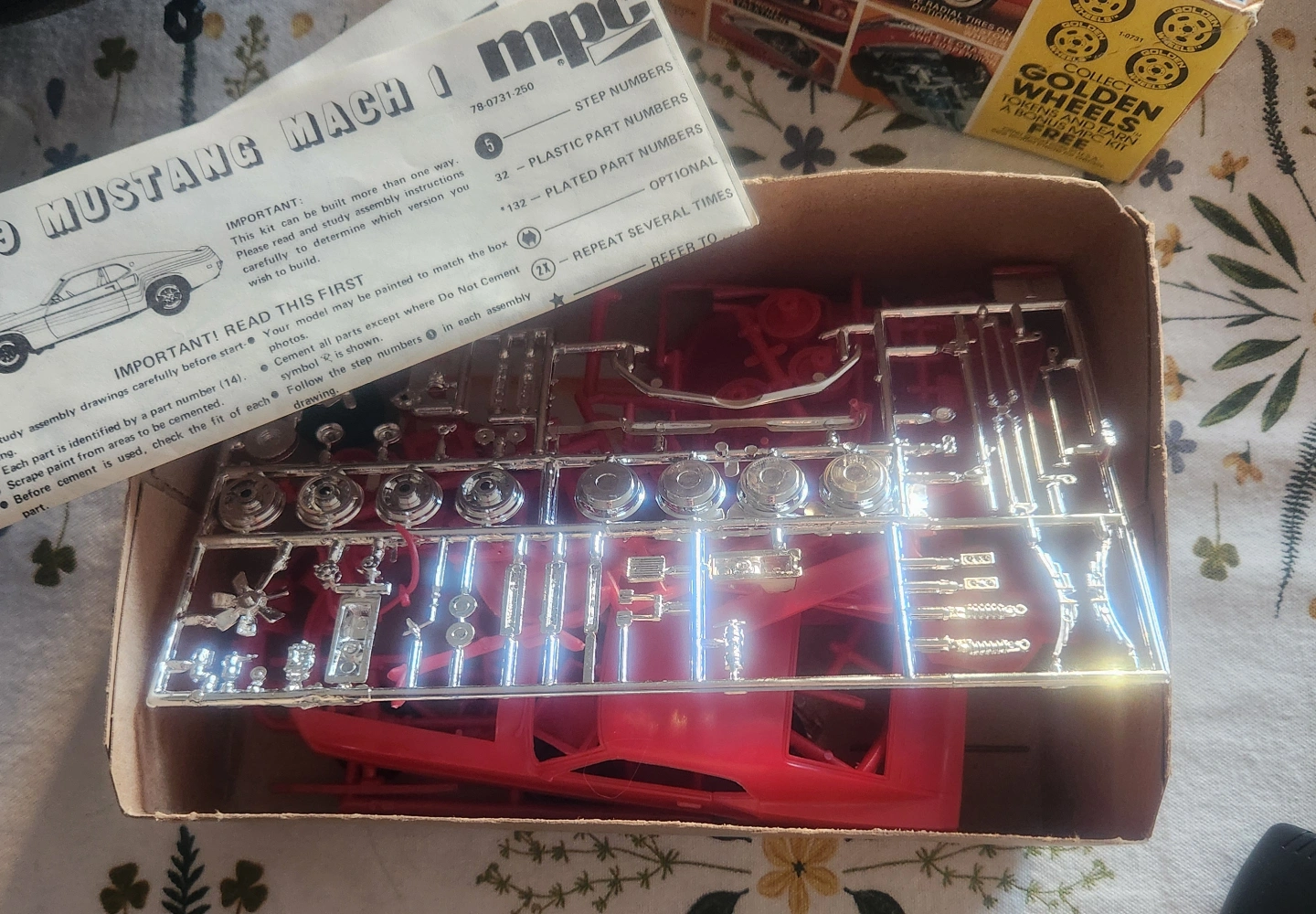 1984 Vintage MPC model kit. 1/25 scale. Features many optional accessories. Includes molded parts, plated parts, shaker hood scoop, and detailed interior. Collect Golden Wheels tokens to earn a bonus MPC kit.