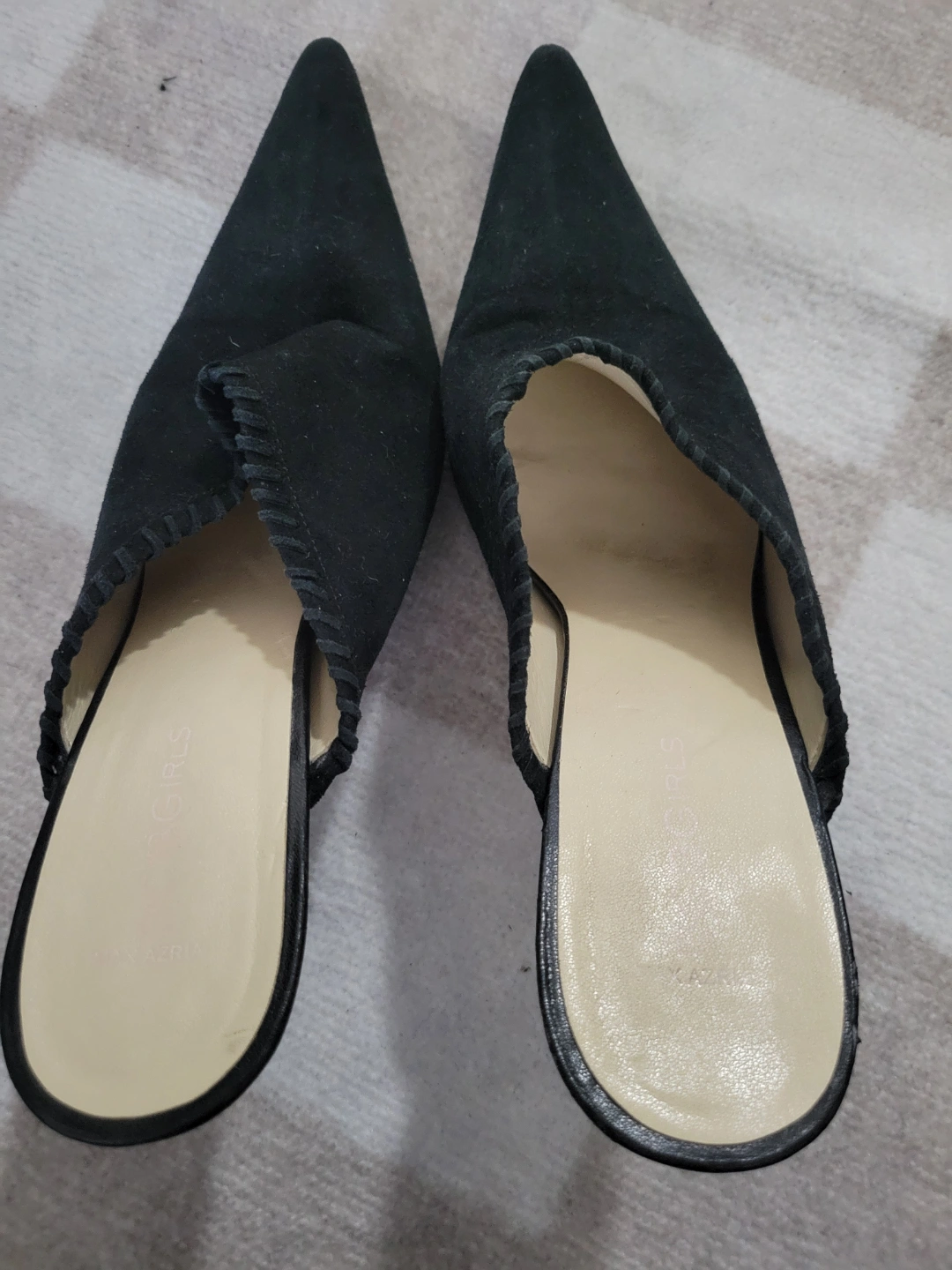 Elegant black suede mules. Pointed-toe design. Features a small stitched detail. Slight heel.