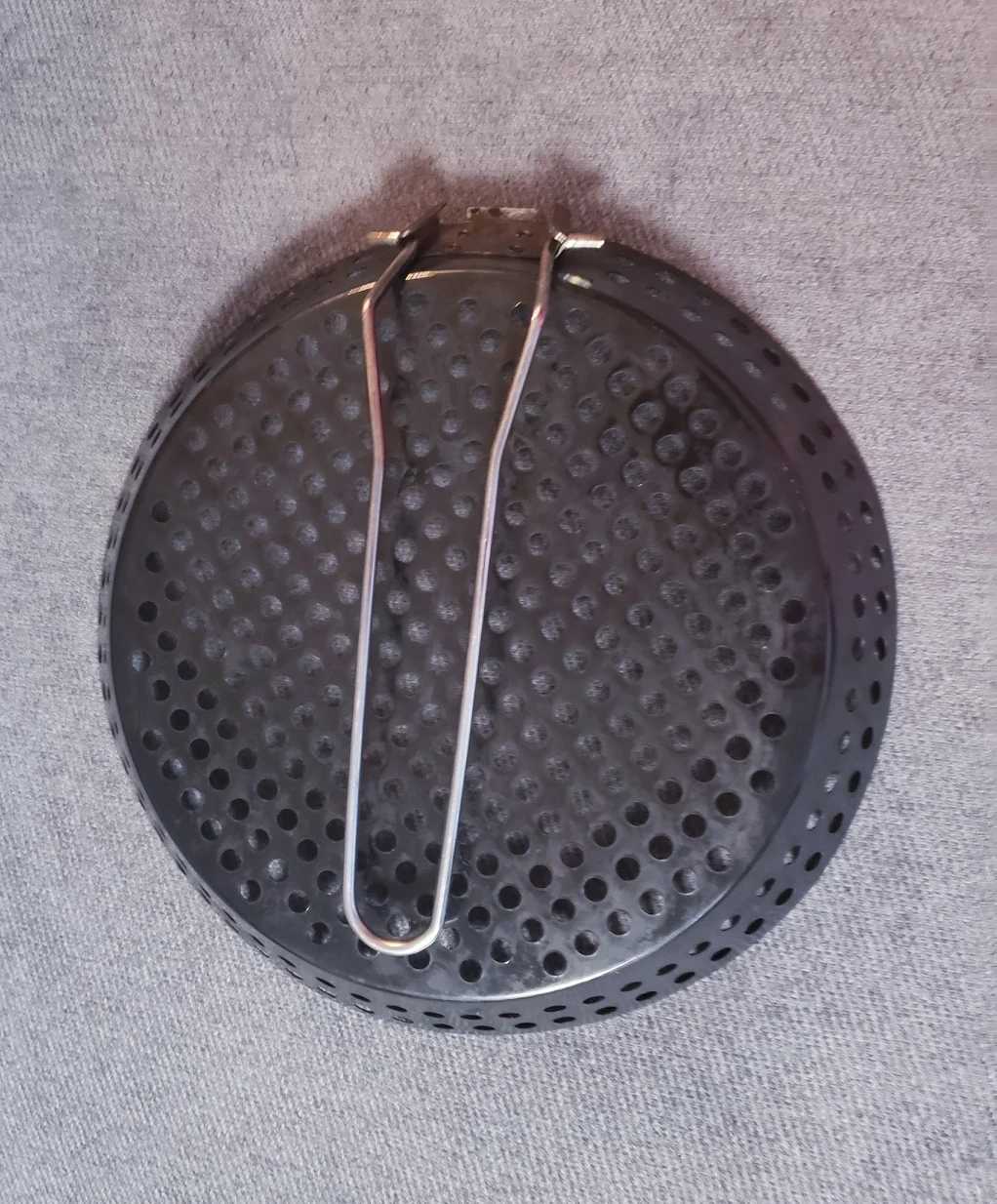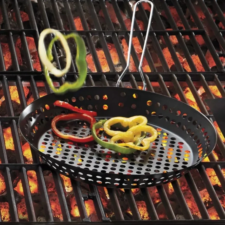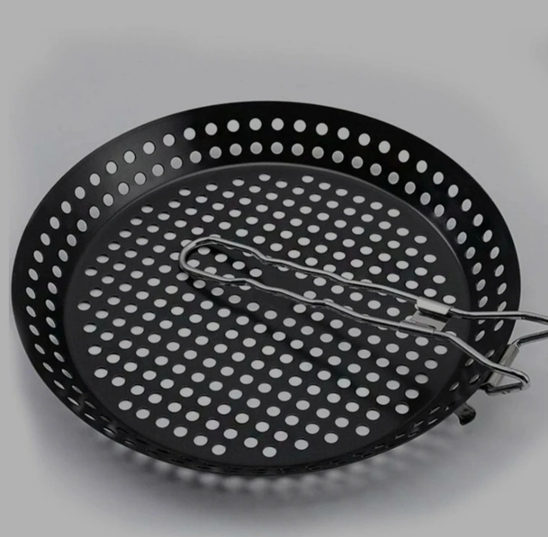 Cook up something delicious with help from this non-stick grill skillet. Great for the BBQ or campfire to grill meat skewers, steaks, chicken, veggies or even cook pizza! The round skillet design with perforated holes allows the flames to get through to the food without allowing small pieces to fall in. Measuring 12" in diameter, this skillet features an easy-to-clean non-stick design and includes a 9" foldable handle that locks in place for convenient storage. Good used condition as only used a couple of times.