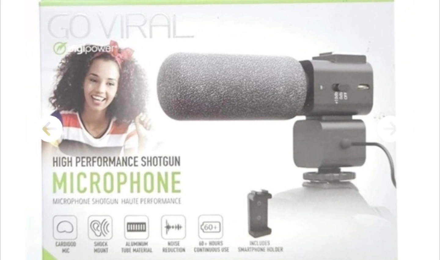 High-performance shotgun microphone. Includes smartphone holder. Aluminium tube material. Noise reduction. 60+ hours continuous use. Cardioid mic. Shock mount.