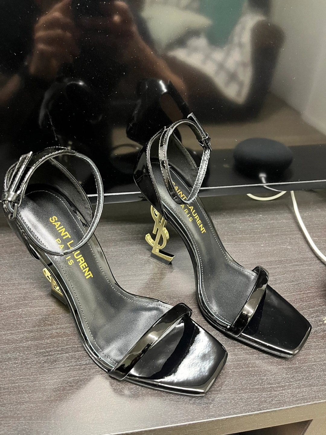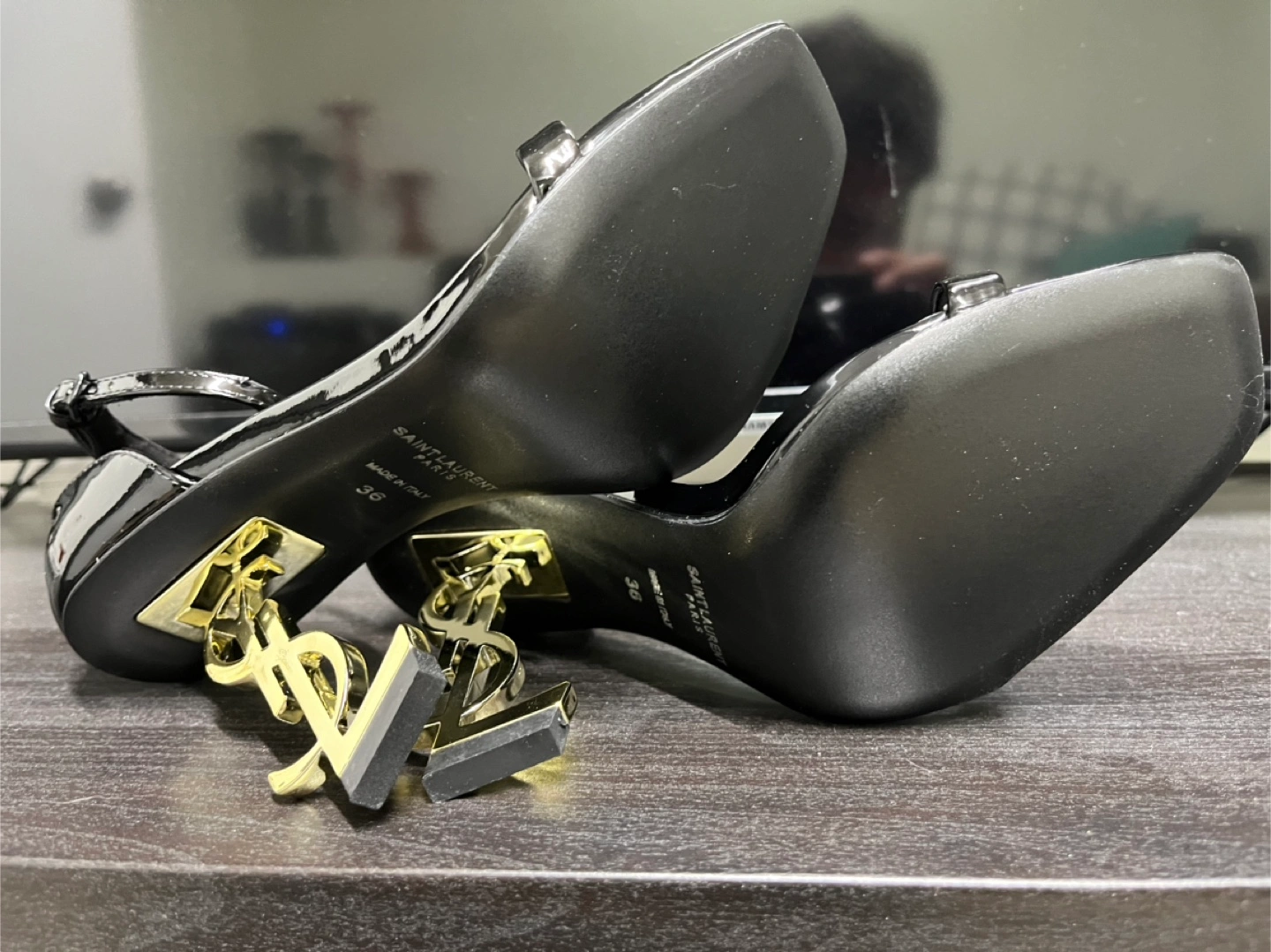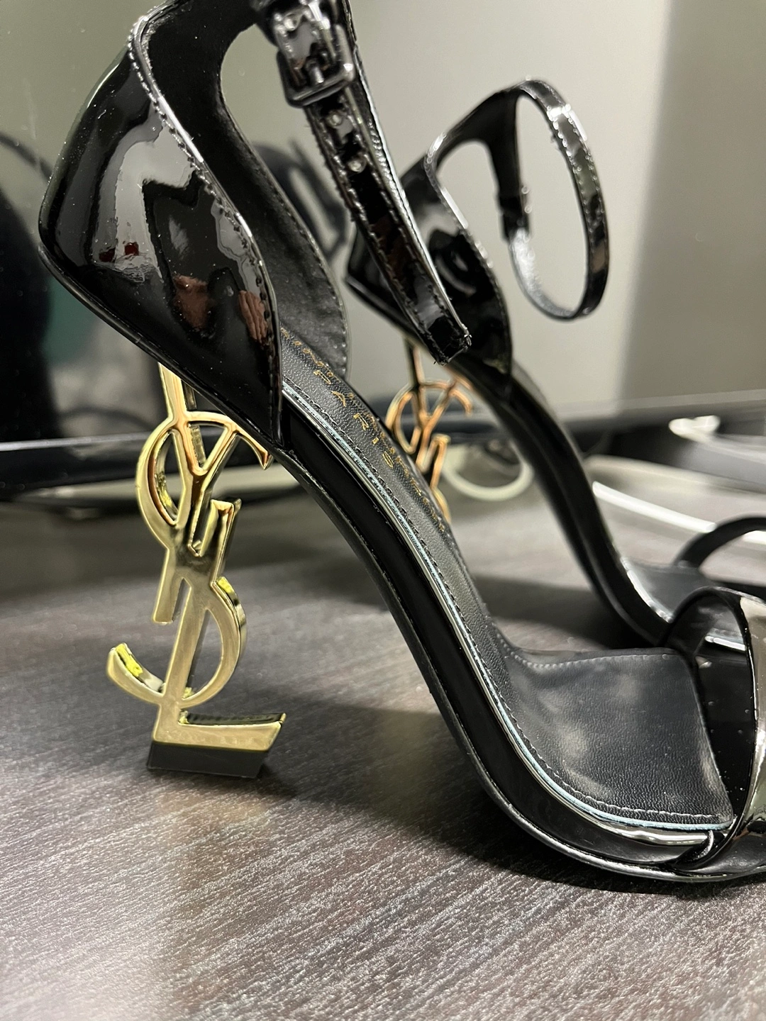 Beautiful black patent leather heels. Ankle strap closure. Gold YSL logo heel. Size 36. Comes with original box and dust bag.