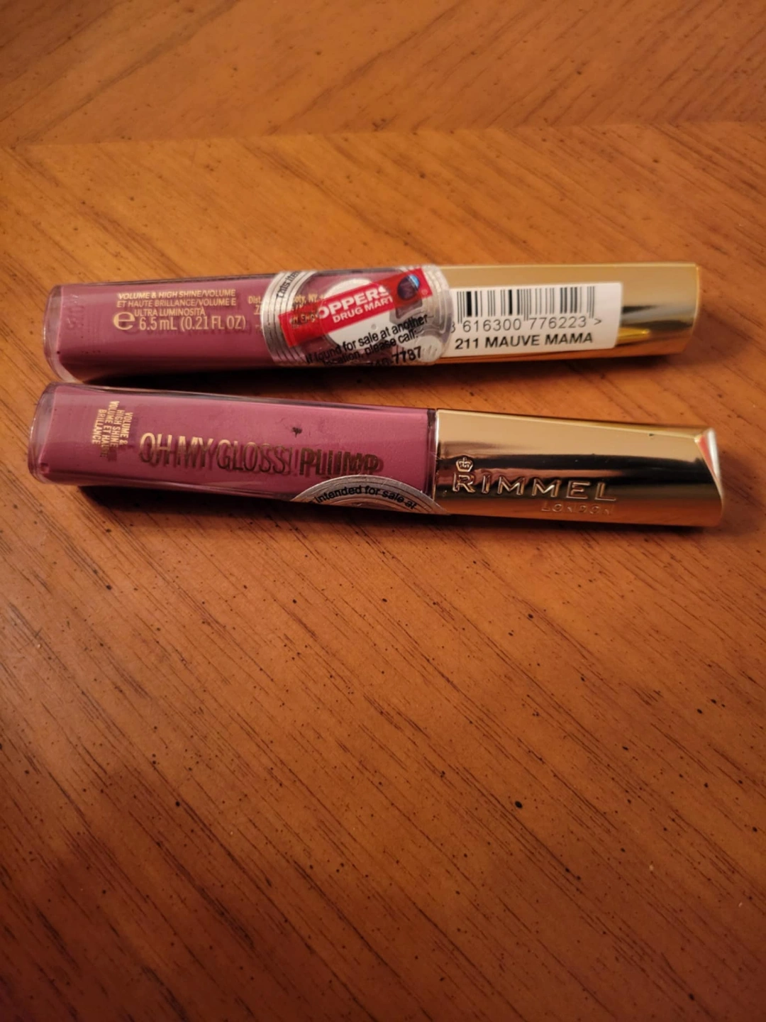 Two lip glosses. One is Rimmel London Oh My Gloss! Plumping Lip Gloss in shade 211 Mauve Mama. Both are mauve-toned.