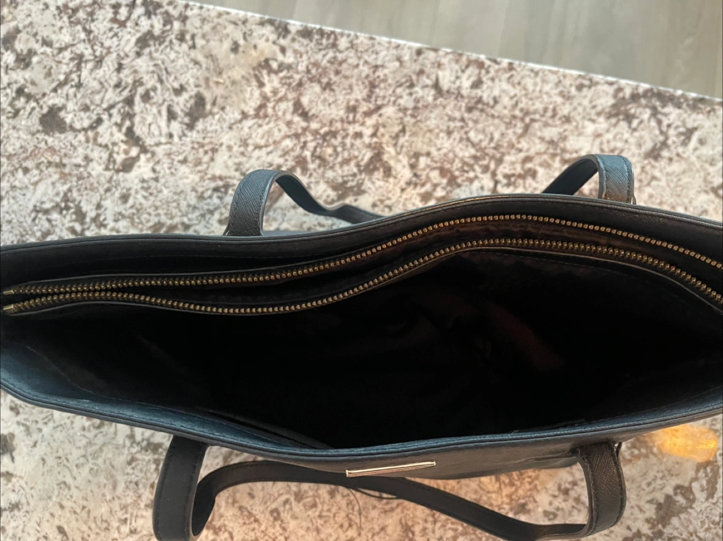 Black tote bag. Double zip closure. Top handles. Good for everyday use. Padded laptop compartment