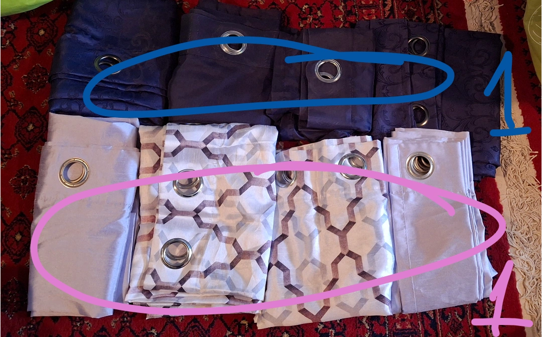 Two sets of curtains. One is Pink with geometric designs. The other one is blue with subtle patterns.