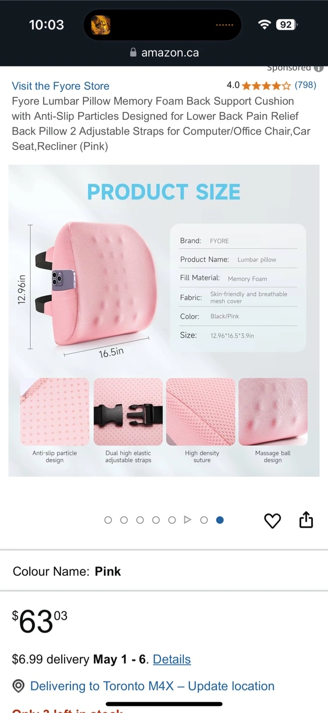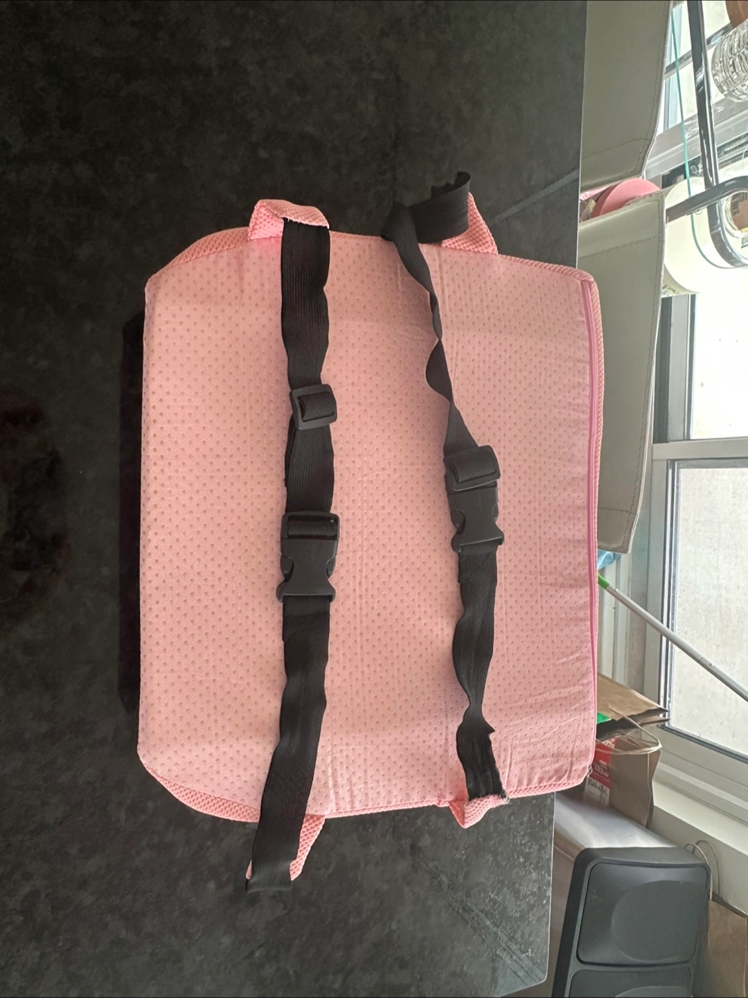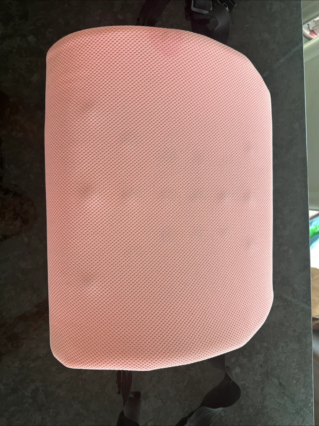 Memory foam lumbar support cushion. Designed for lower back pain relief. Anti-slip particles. Two adjustable straps for chairs. Pink. Some wear on the straps as pictured.