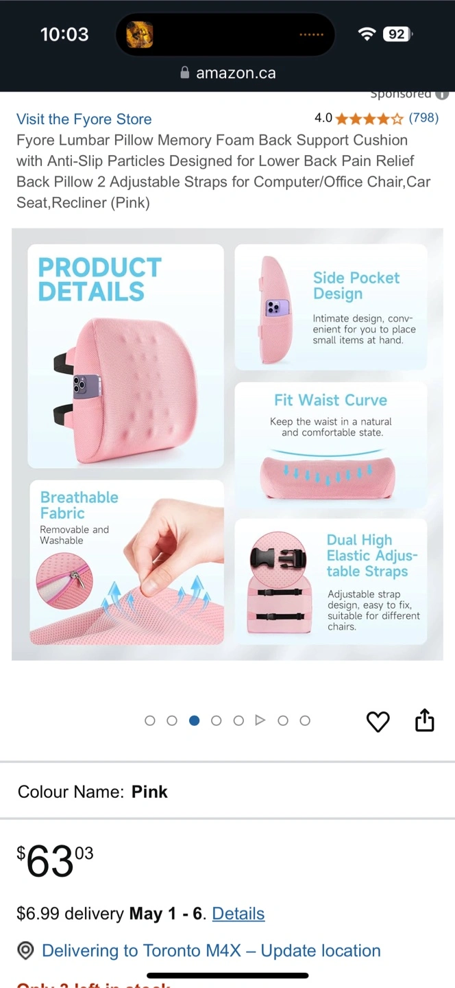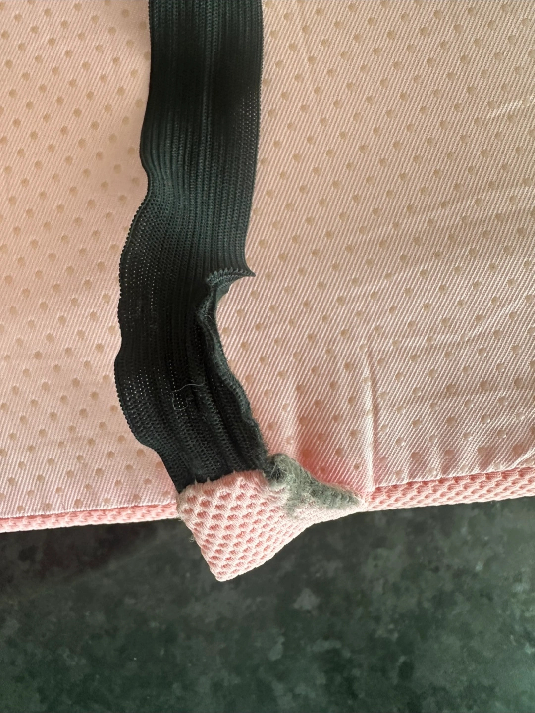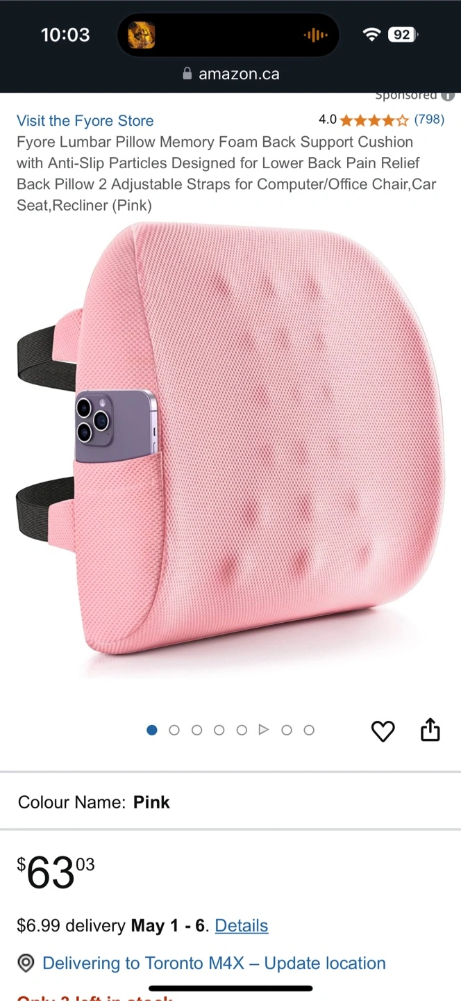Memory foam lumbar support cushion. Designed for lower back pain relief. Anti-slip particles. Two adjustable straps for chairs. Pink. Some wear on the straps as pictured.