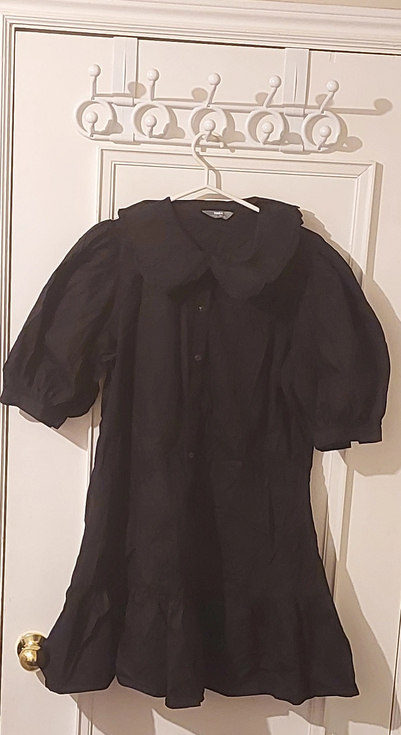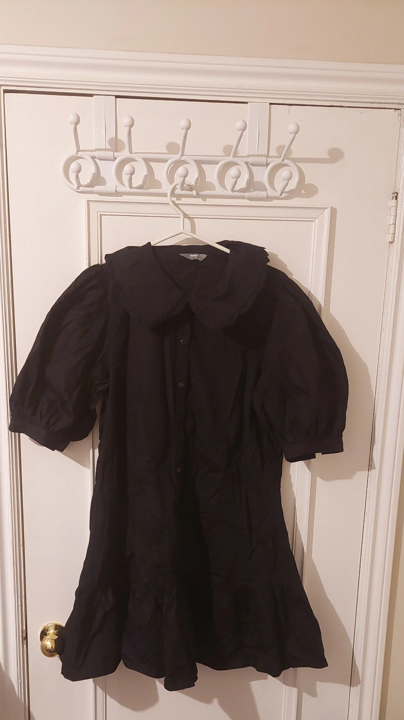 Cute black mini dress. Features a Peter Pan collar, puff sleeves, and button-up front. A-line silhouette. Size UK 16.