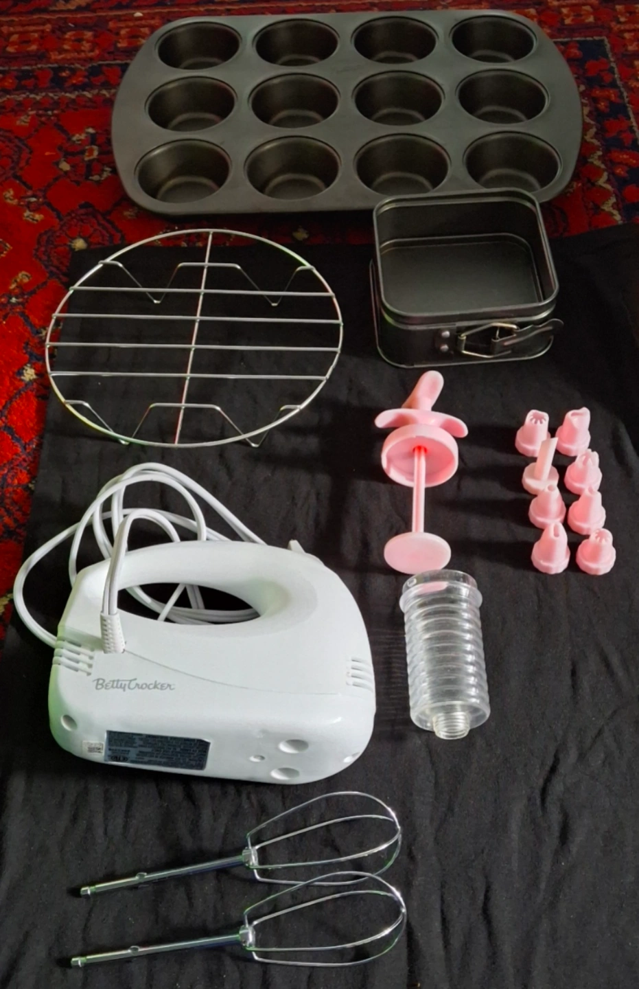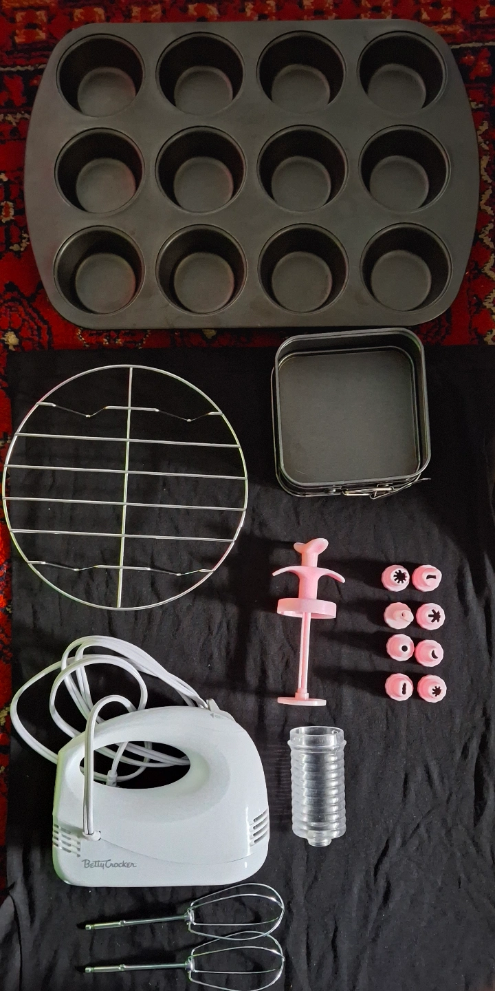 Baking set includes Betty Crocker hand mixer, 12 Cupcake Tray, square cake tin, cooling rack, decorating tips and coupler, and piping bag. Great for beginners or experienced bakers.
