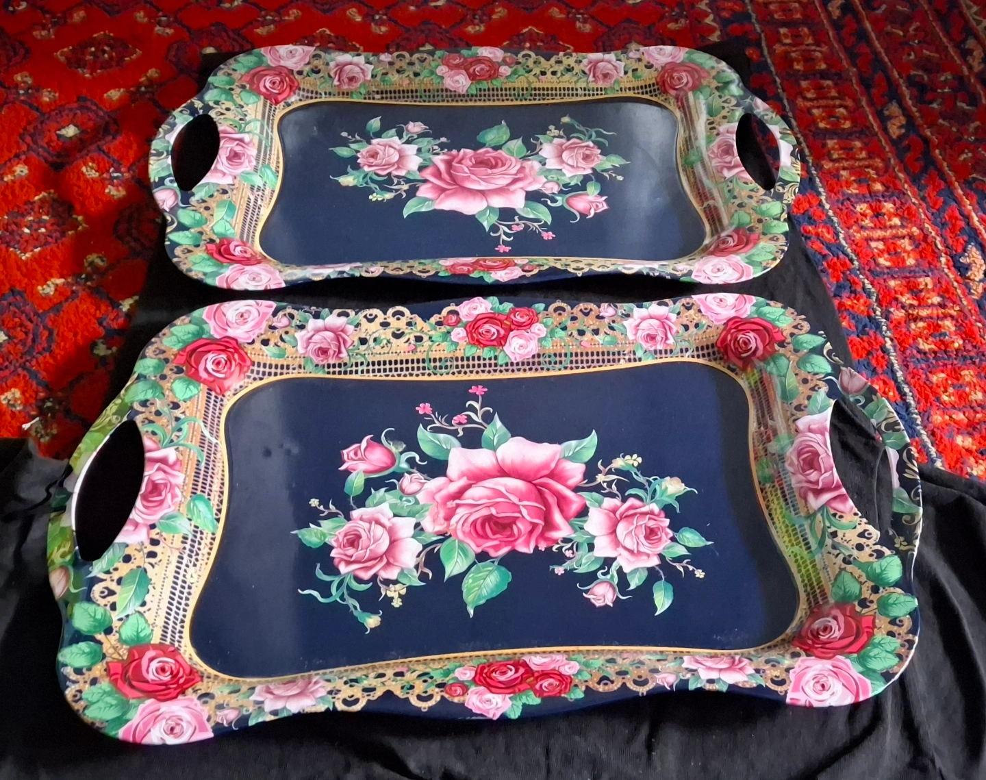 Two matching trays. Dark background, floral design. Features handles. Ideal for serving or decor.
