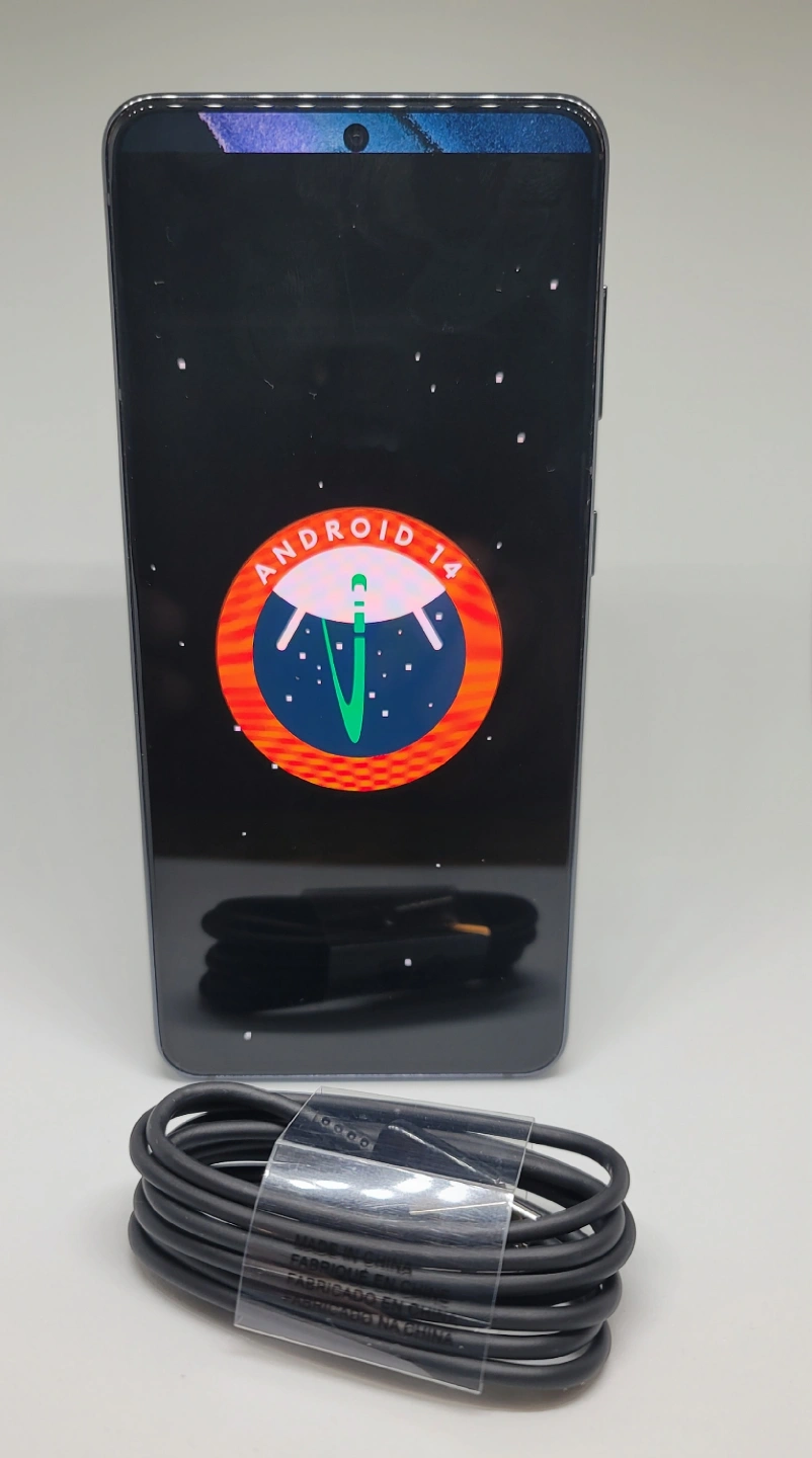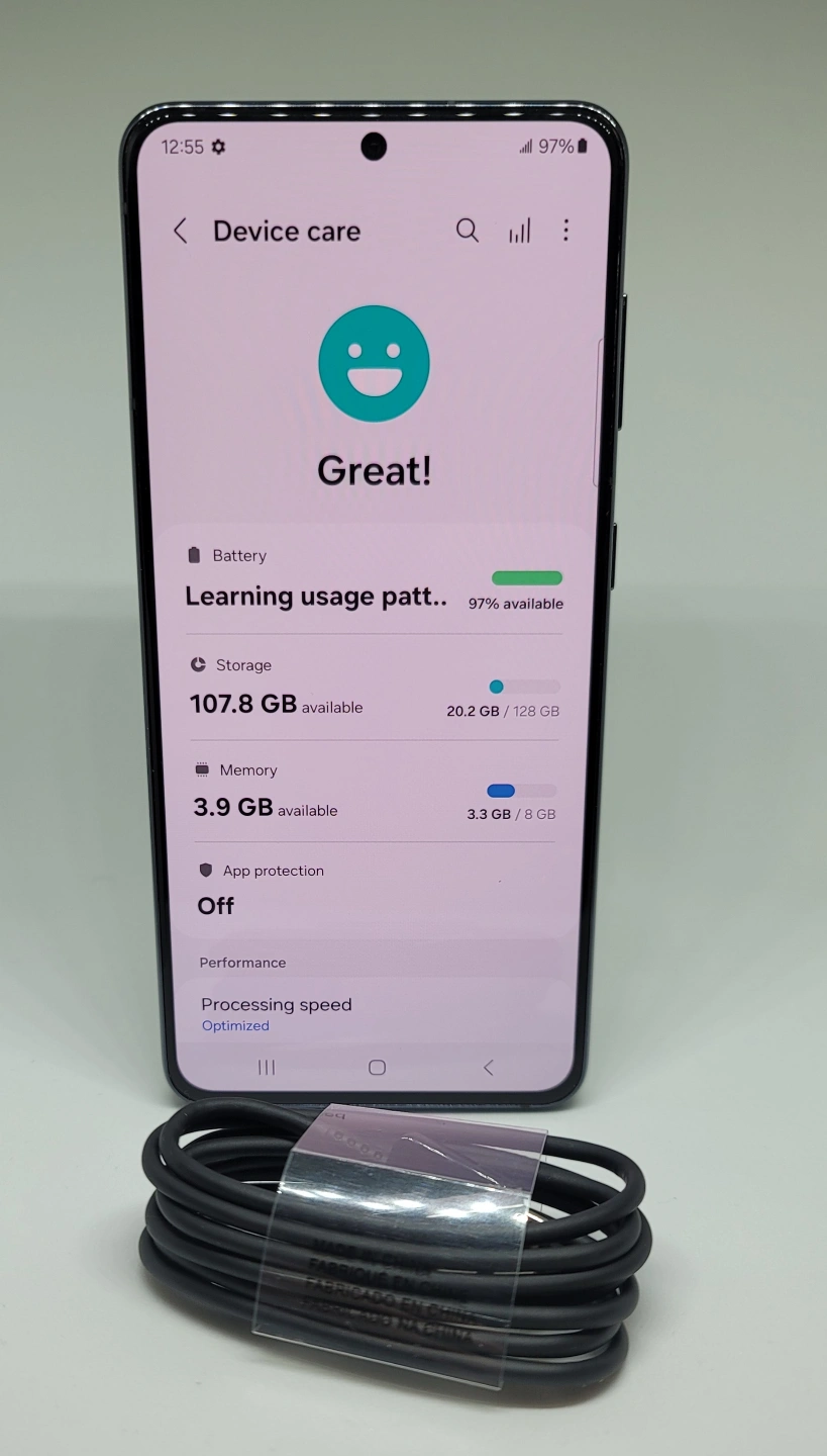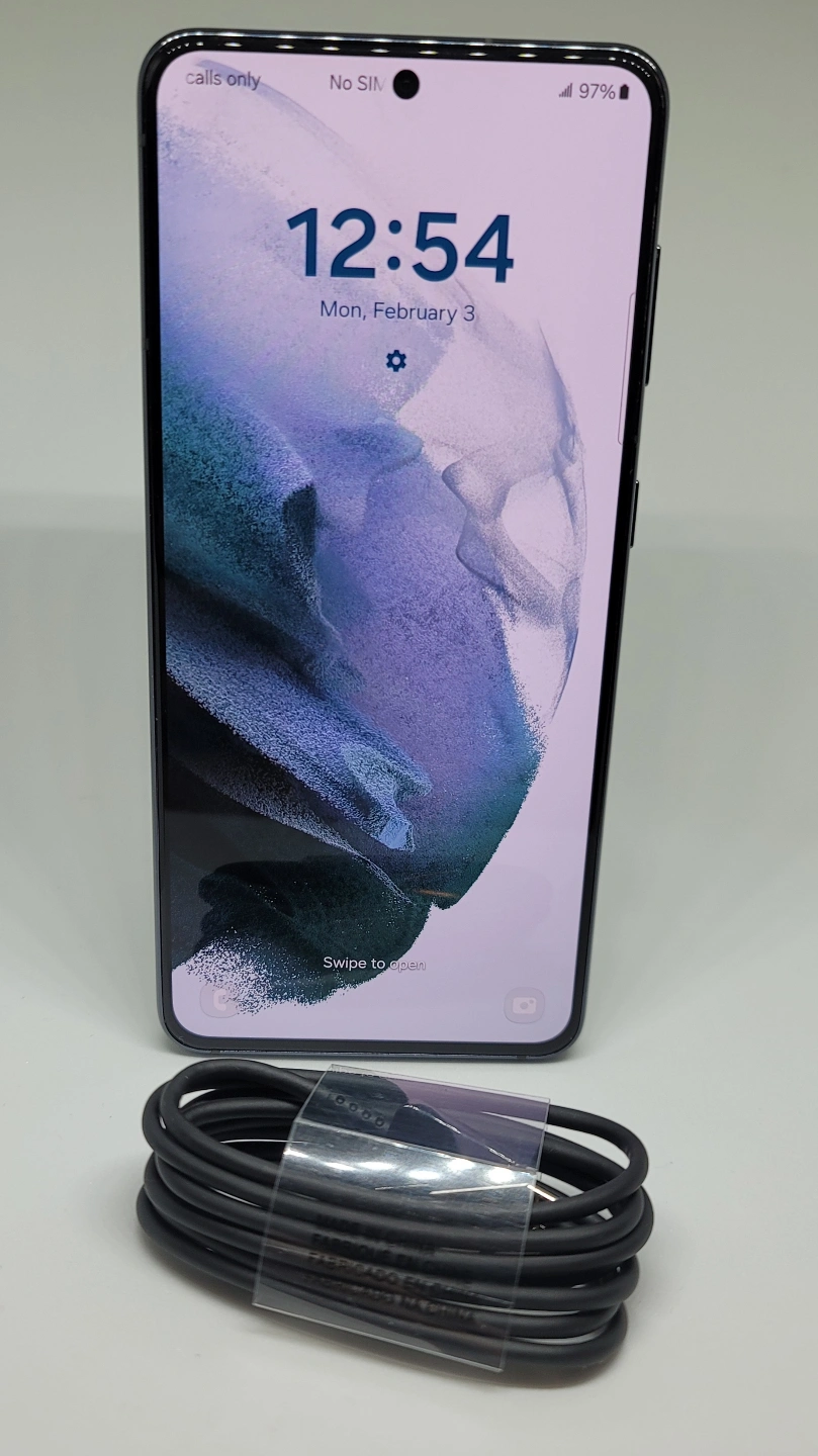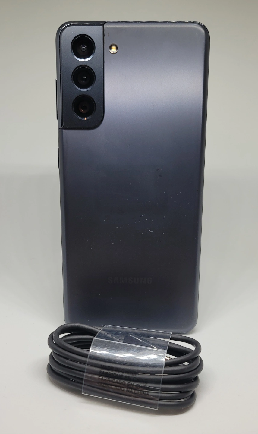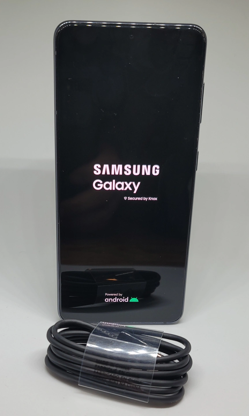 Unlocked Samsung Galaxy S21 5G smartphone. 128 GB storage. Black colour. Includes charging cable. Excellent condition.