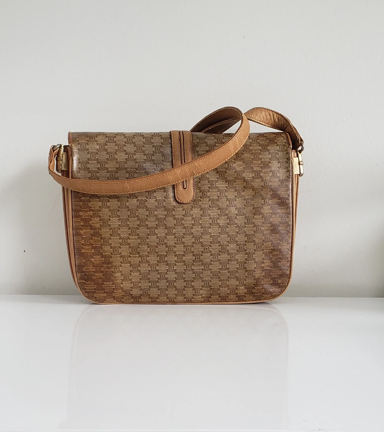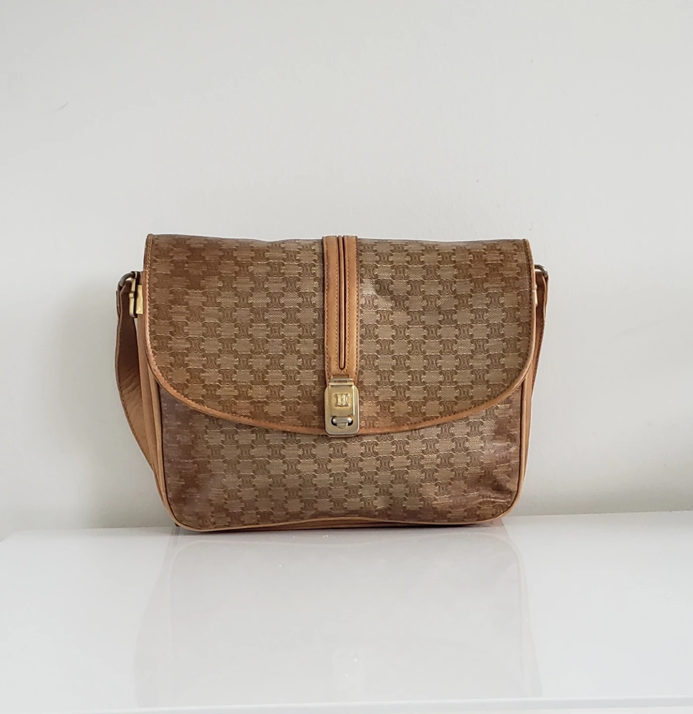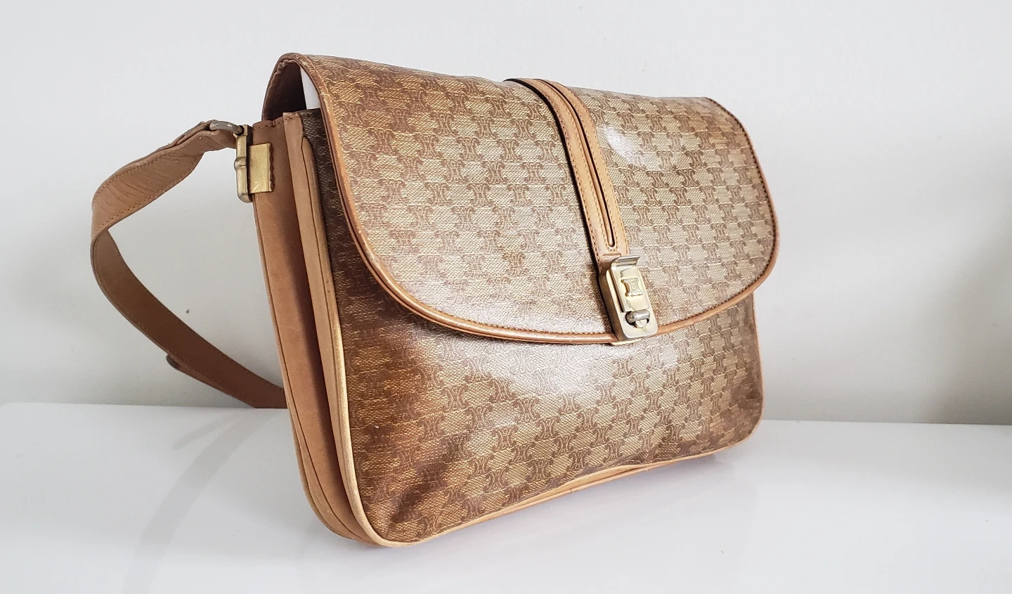 Celine Macadam PVC & Leather Crossbody Bag w/ Gold Hardware. Bag is in good vintage condition: please review all photos and description review to manage expectations. Dual compartment, inner zip pocket. Triomphe hardware clasp. Exterior: pvc has some discolouration along perimeter, leather has been rubbed in spots along base, strap has significant wear (rubbed along u/s where worn against shoulder and there's minor cracking), some tarnishing on gold hardware; Interior: in excellent condition, no defects. Approx Dims: 10" x 7" x 3"