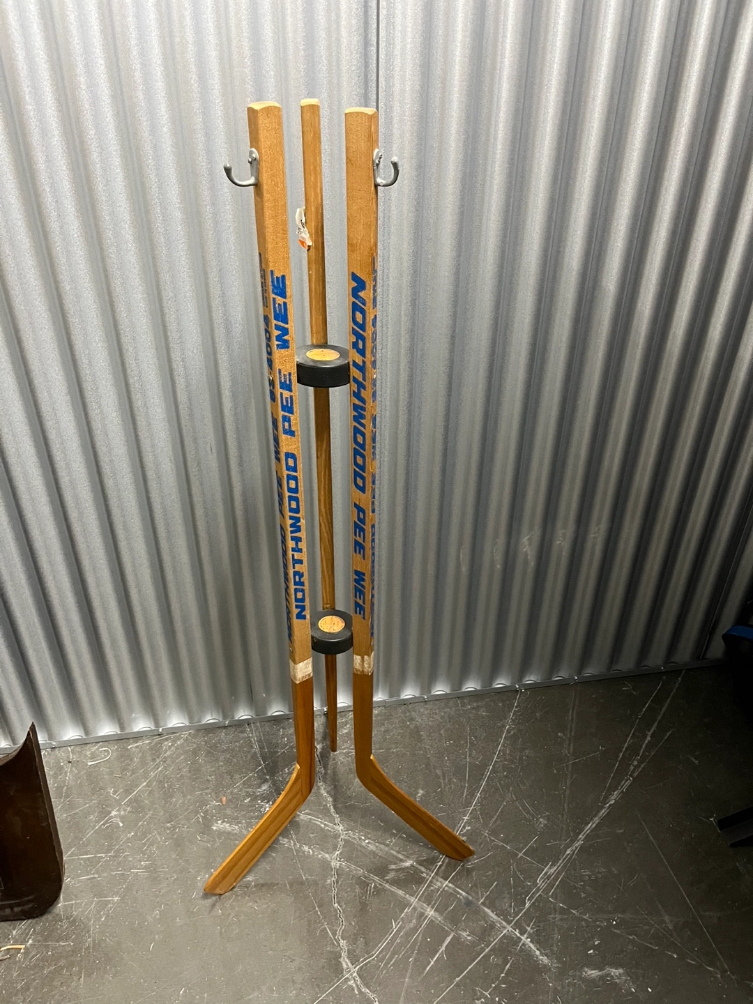 Wooden hockey stick rack. Three sticks included. Features two small hooks at the top. Great for display or storage.