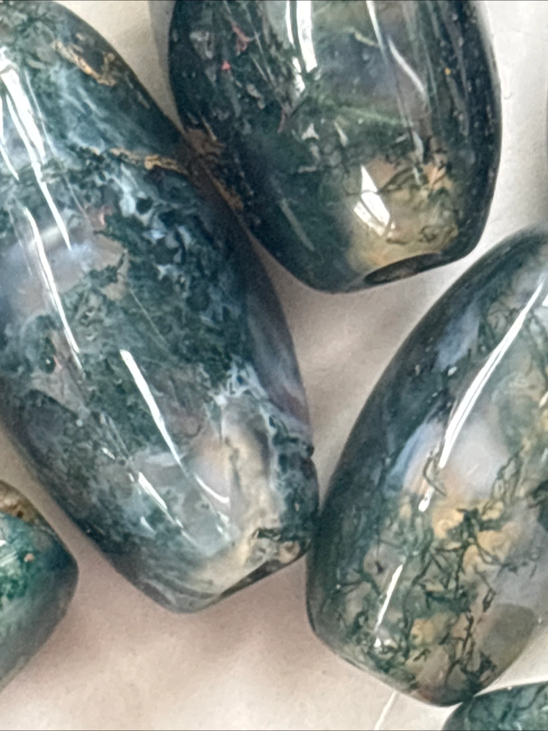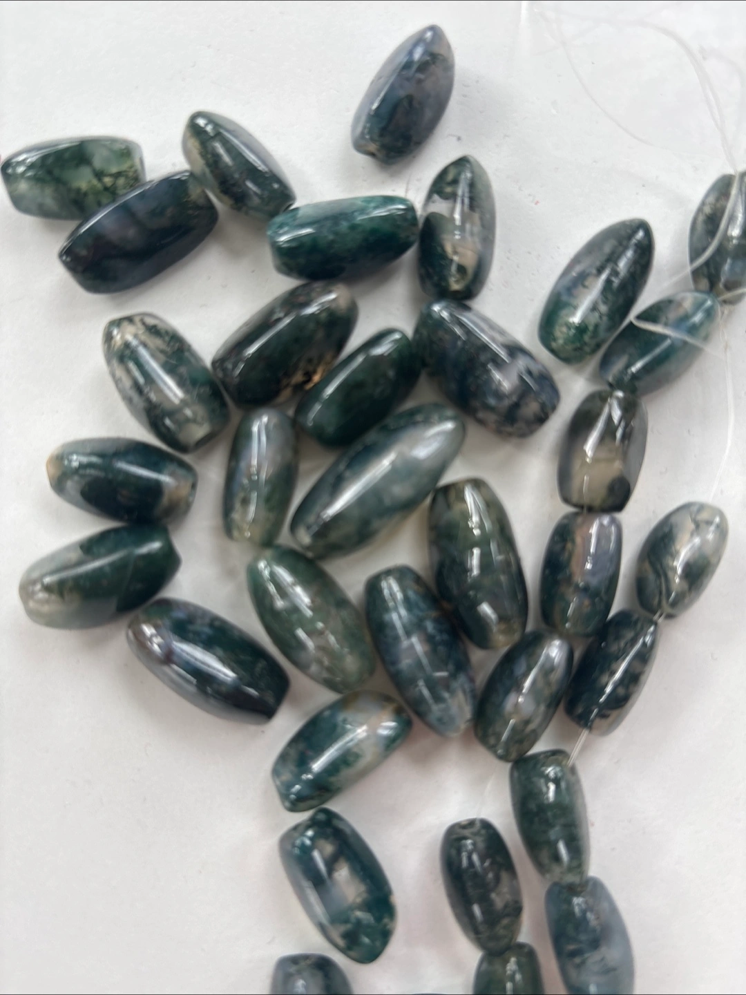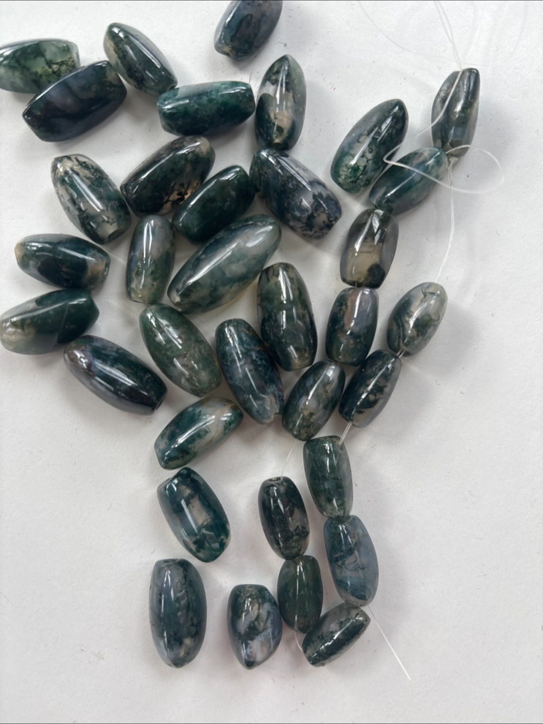 Approximately 35 moss agate beads. Oval shape. Great for jewellery making. Various shades of green and grey. Sold as seen.