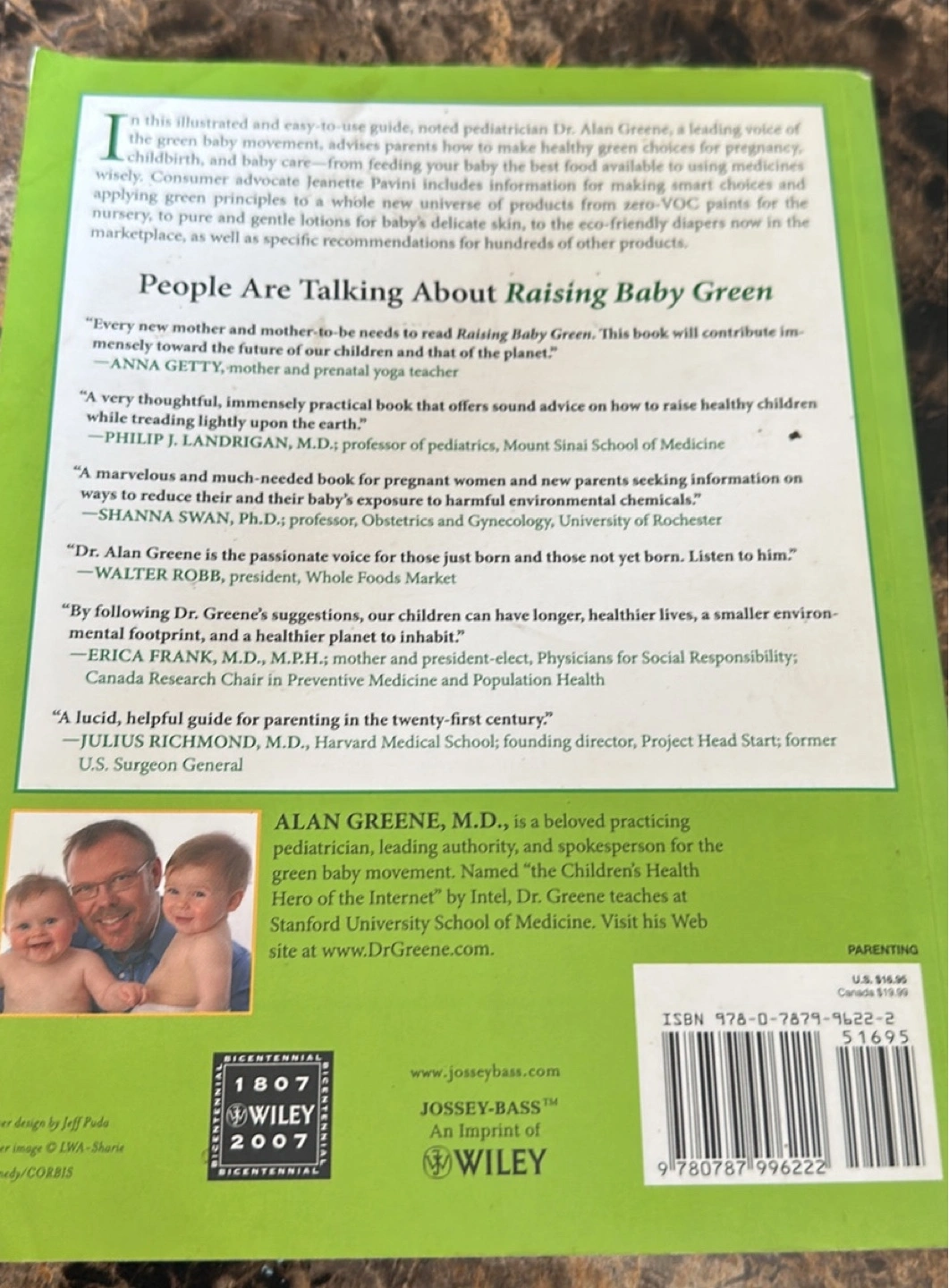 Used book. Good condition. Alan Greene, M.D. with Jeannette Pavini & Theresa Foy DiGeronimo. Includes more than 300 best green baby products for smart parenting choices. Practical guide for parents.