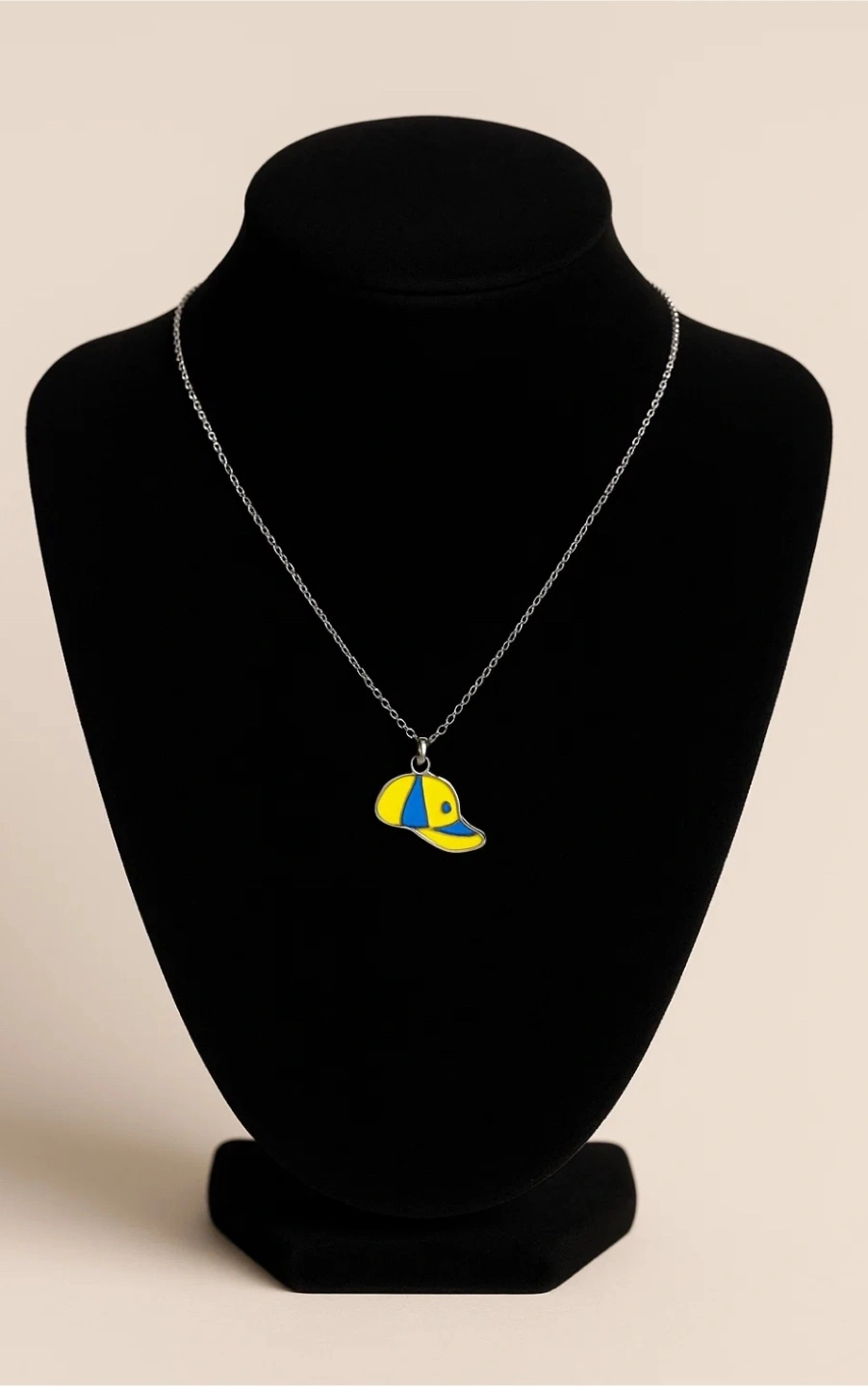 Silver chain necklace. Features a small enamel baseball cap charm. Yellow and blue colours. 925 silver