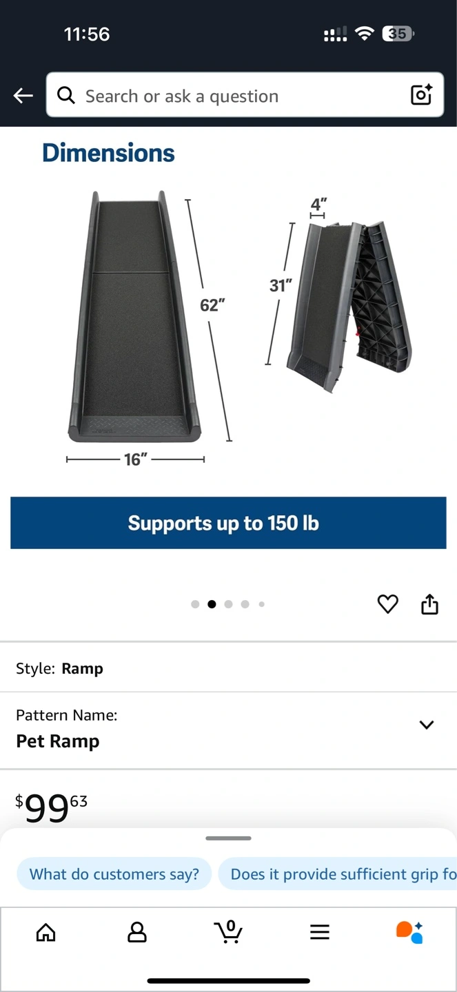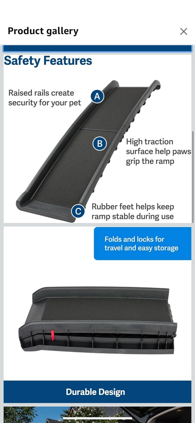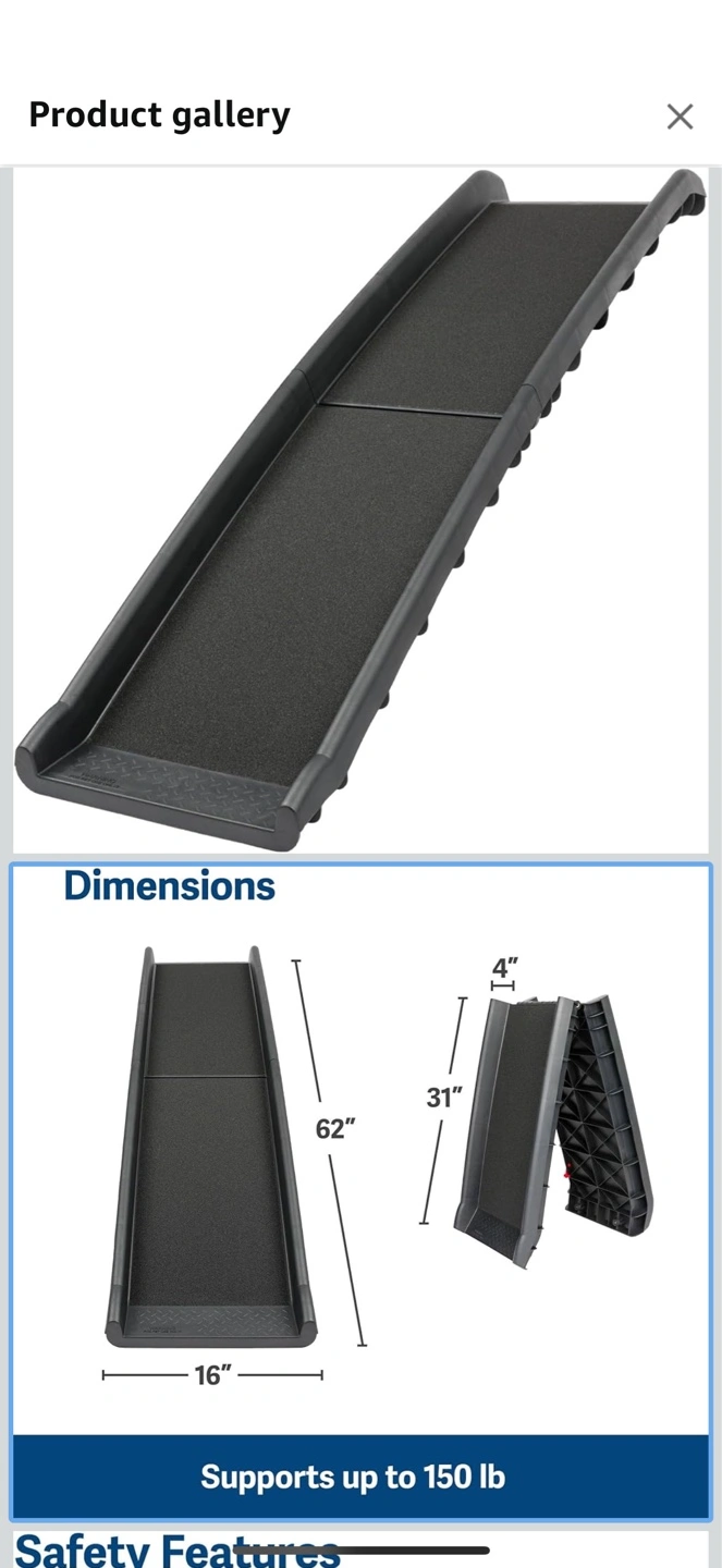 New pet ramp in box. Folds for easy storage. Supports up to 150 lbs. Black colour. Measures 62" long, 16" wide, and 4" high when unfolded. 31" wide when folded. Pick up at Frobisher Lane.