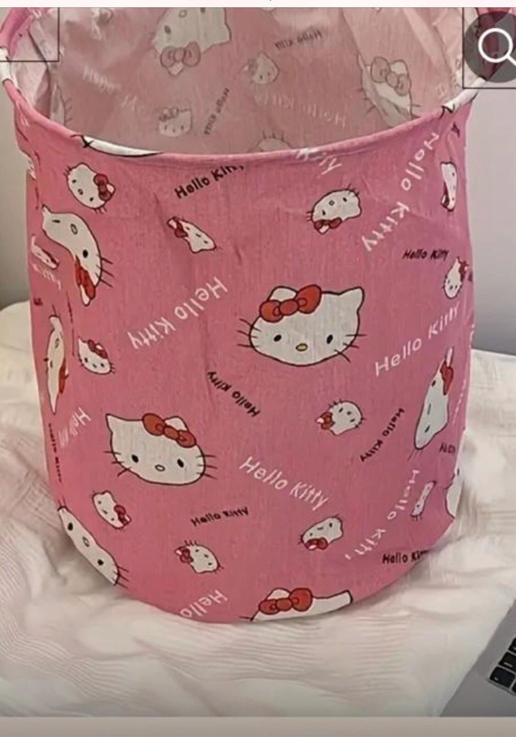 Pink Hello Kitty hamper. Features a cylindrical shape and Hello Kitty pattern. Great for organizing laundry.