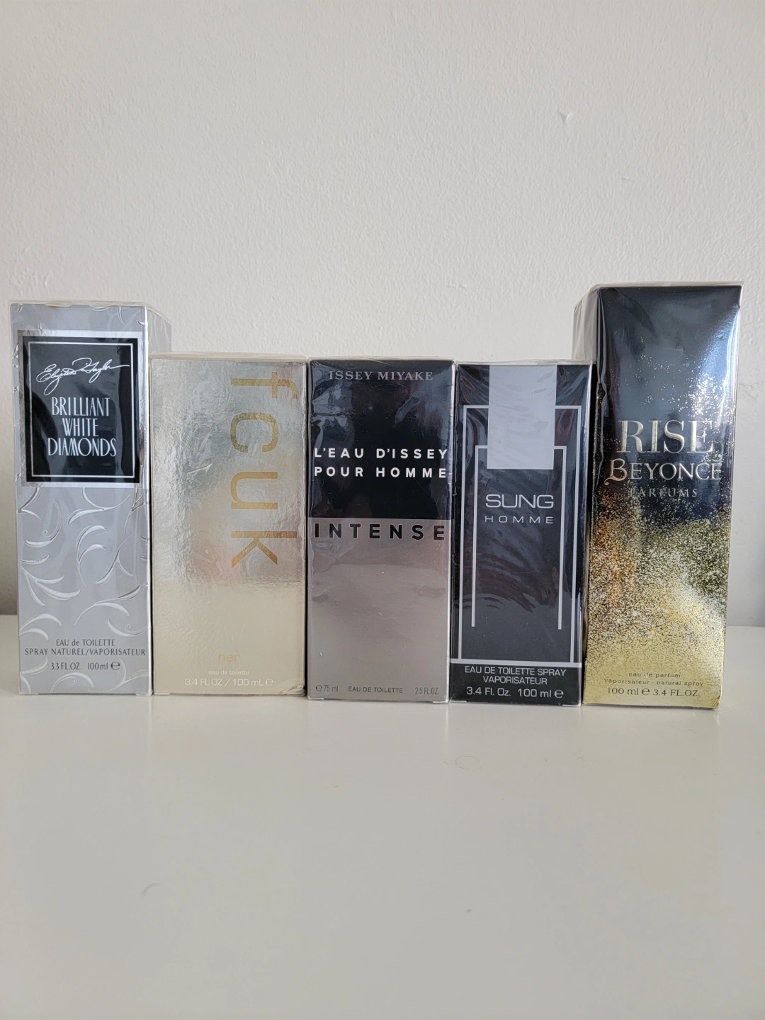 Beyonce Rise $35 Elizabeth Taylor Brilliant white diamonds $20 Sung Home (for men) $15 Issey Miyake Intense (for men) $20 Fuck her $20