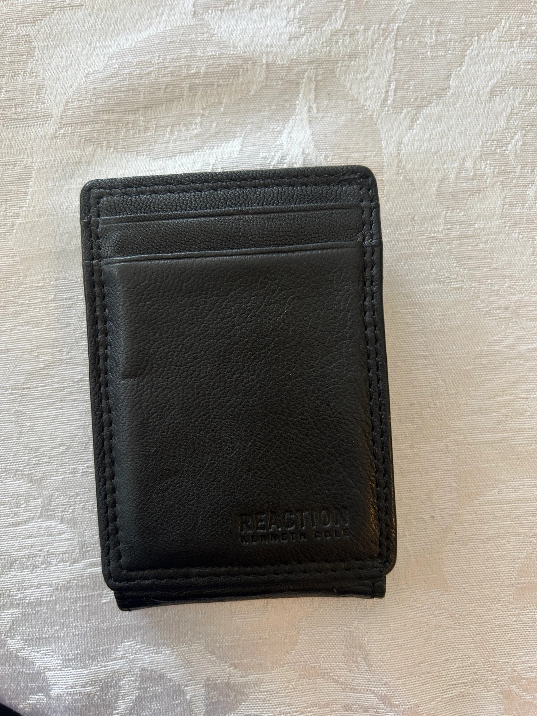 Black leather bi-fold wallet, with magnet. Features multiple card slots and a clear ID window. Genuine leather construction.