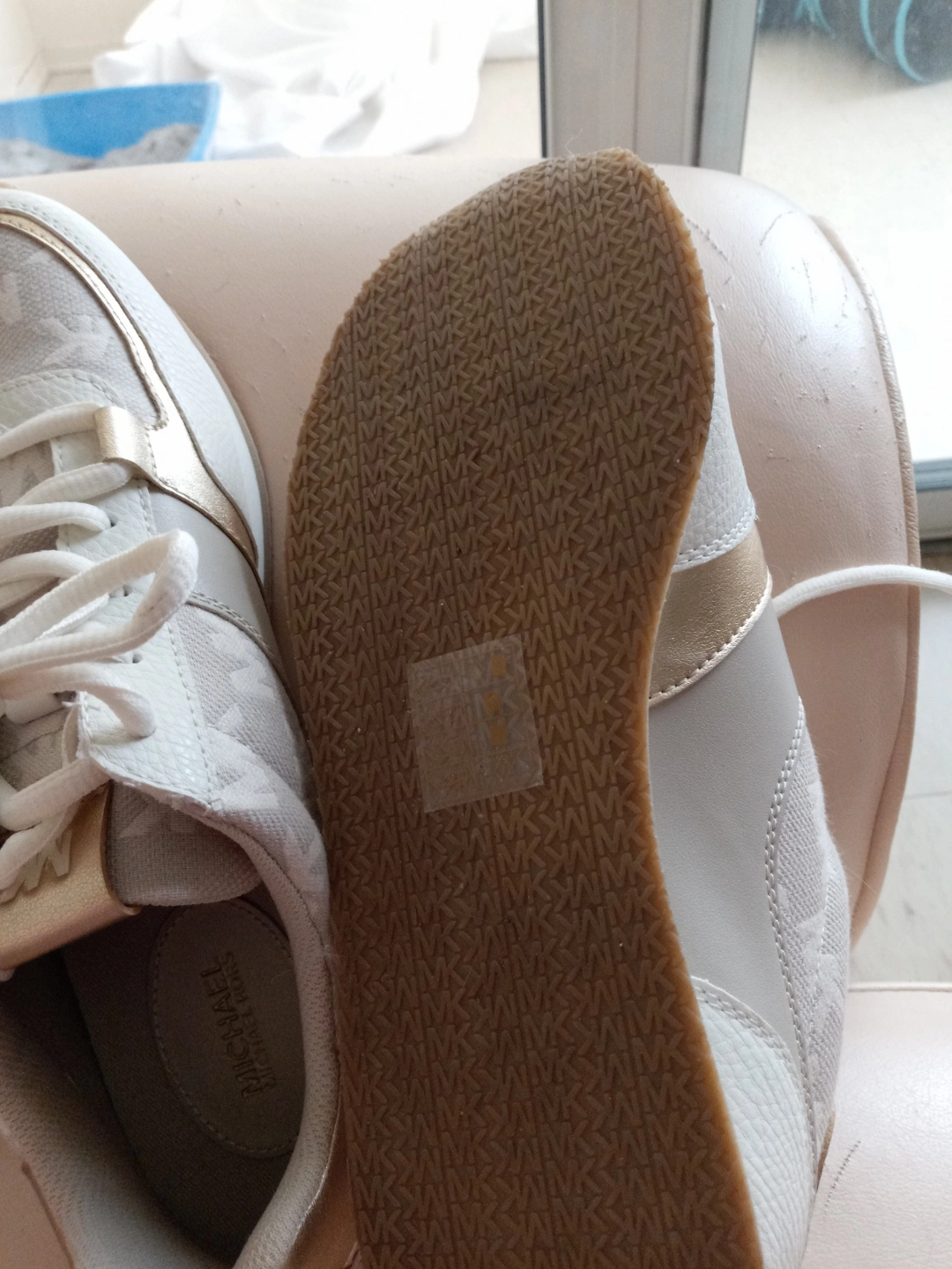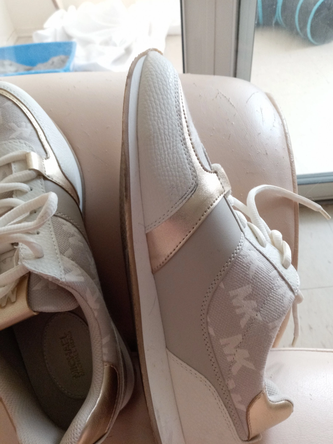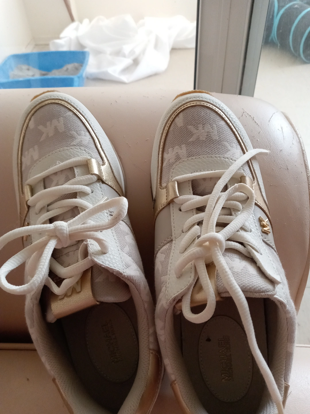 Pair of women's Michael Kors sneakers. Off-white and gold colour scheme. MK logo throughout. Lace-up closure. Casual style.