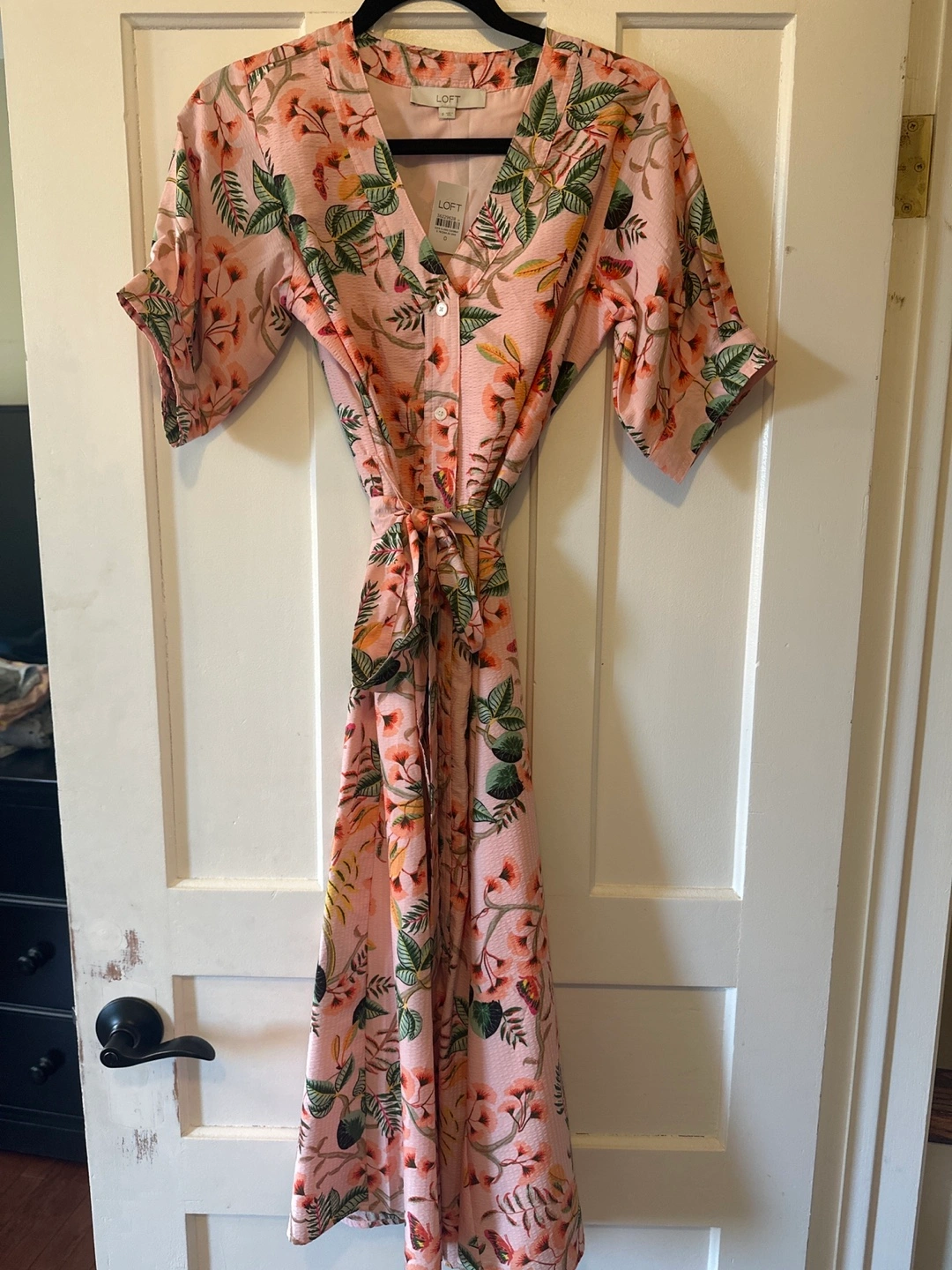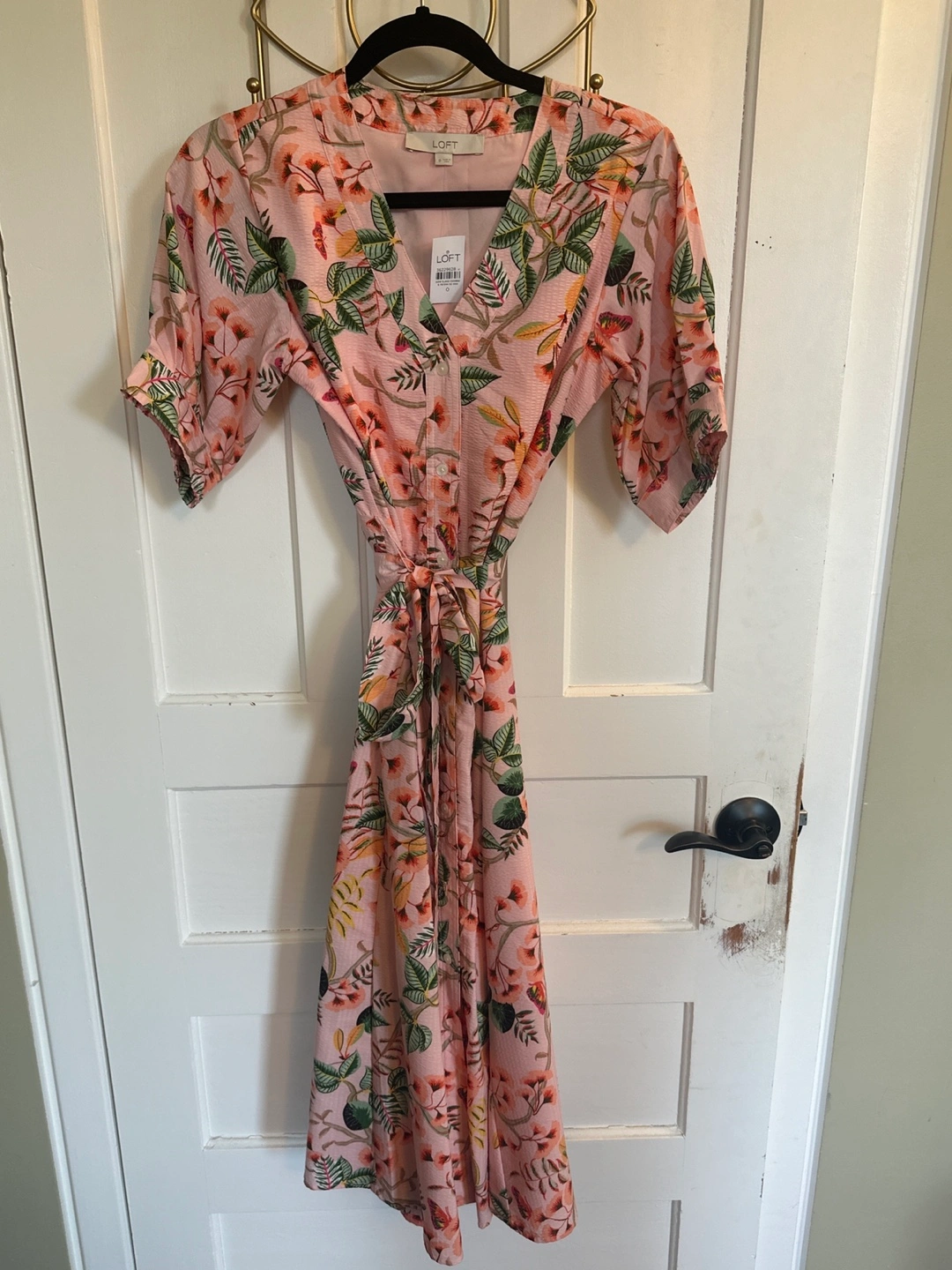 Beautiful pink floral midi dress. Short sleeves, V-neck, button front, and a tie waist. Lightweight and perfect for spring or summer. Size 0. Brand new. Tags still attached. Never worn.