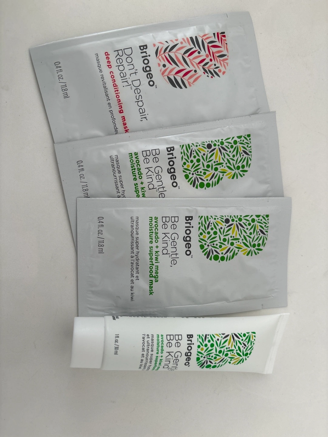 Set of Brigeo hair masks. Includes one 30mL Don't Despair Repair Deep Conditioning Hair Mask and three mini Be Kind Avocado + Kiwi Moisture Superfood Masks. Travel-sized and perfect for trying new products. Approximately a $21 + tax value