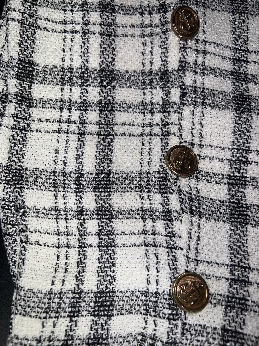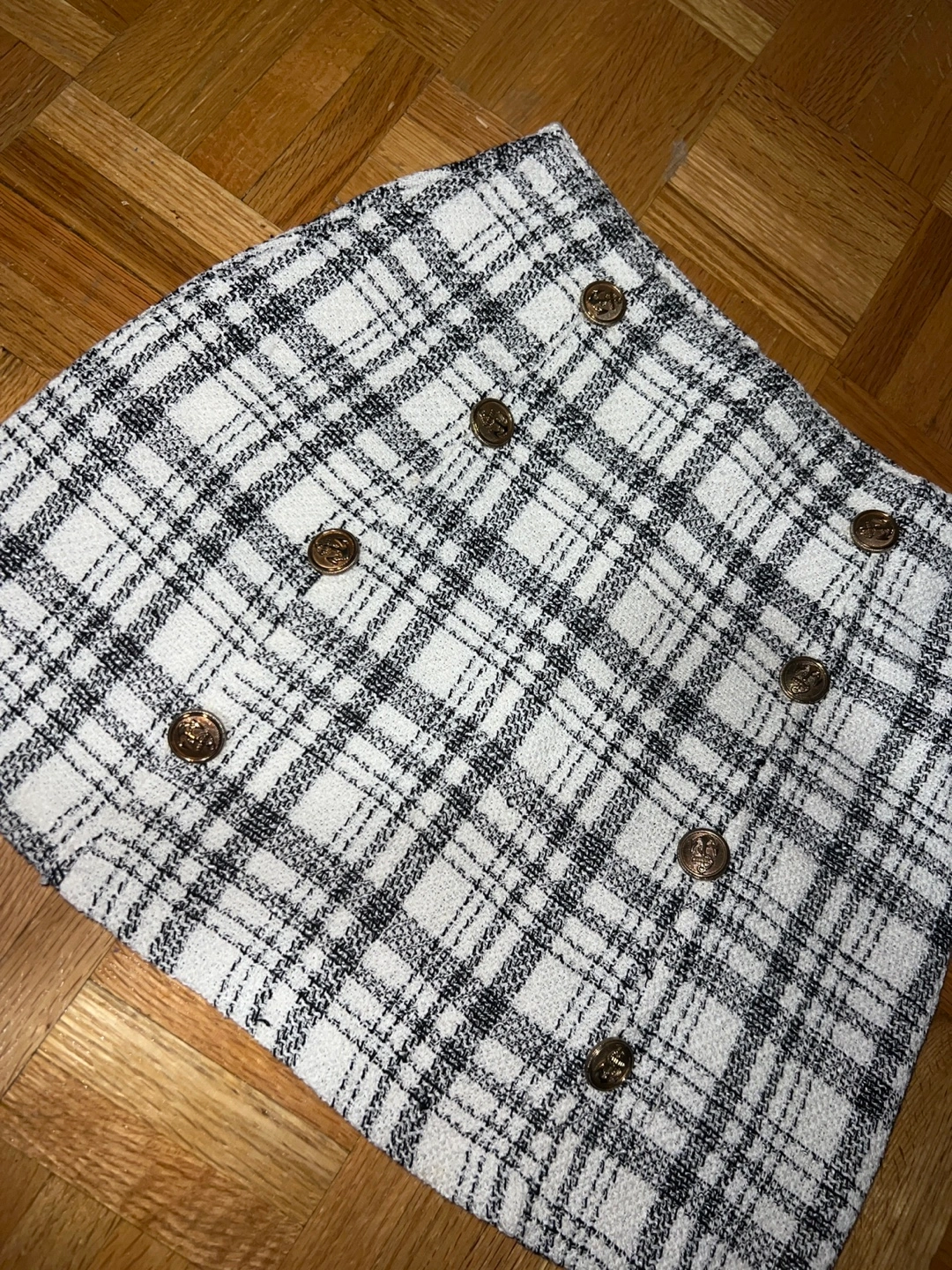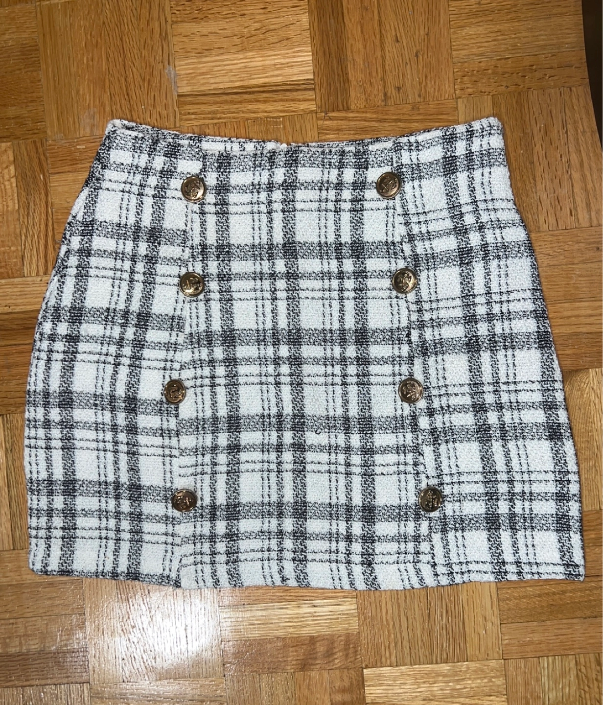 Not my style anymore❣️ Adorable mini skirt. Black and white plaid pattern. Gold-toned buttons. Looks great with tights and boots.