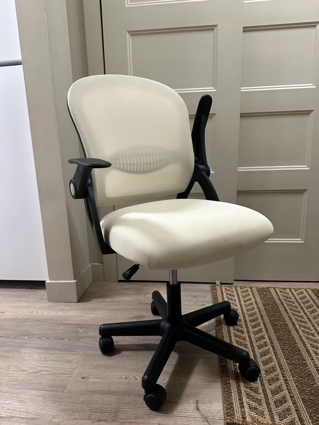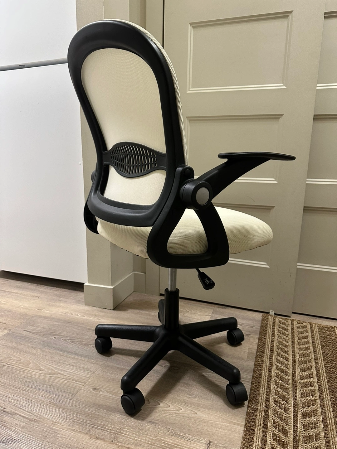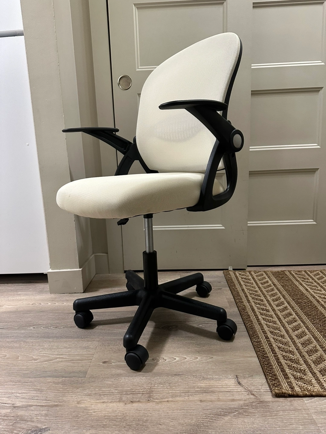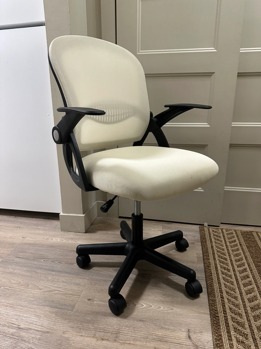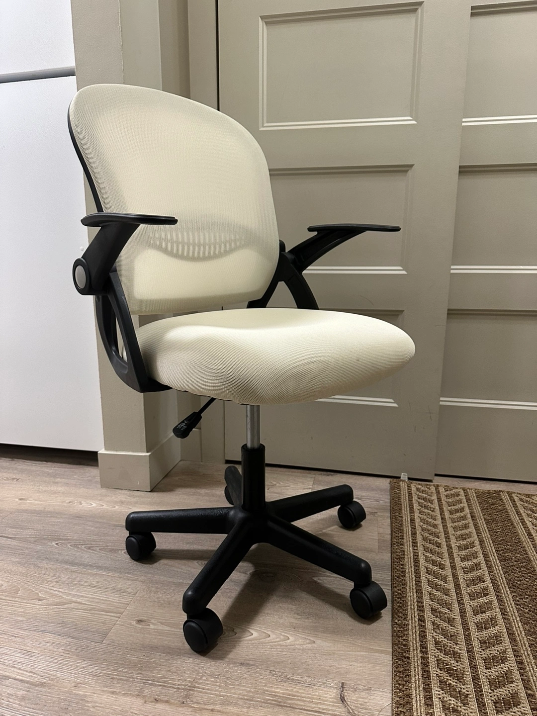 Brand new ergonomic home office swivel desk chair with a breathable mesh back, pneumatic gas-lift height adjustment, 360° rotation, and space-saving flip-up armrests, upholstered in elegant cream fabric. Available for pickup in Red Deer.