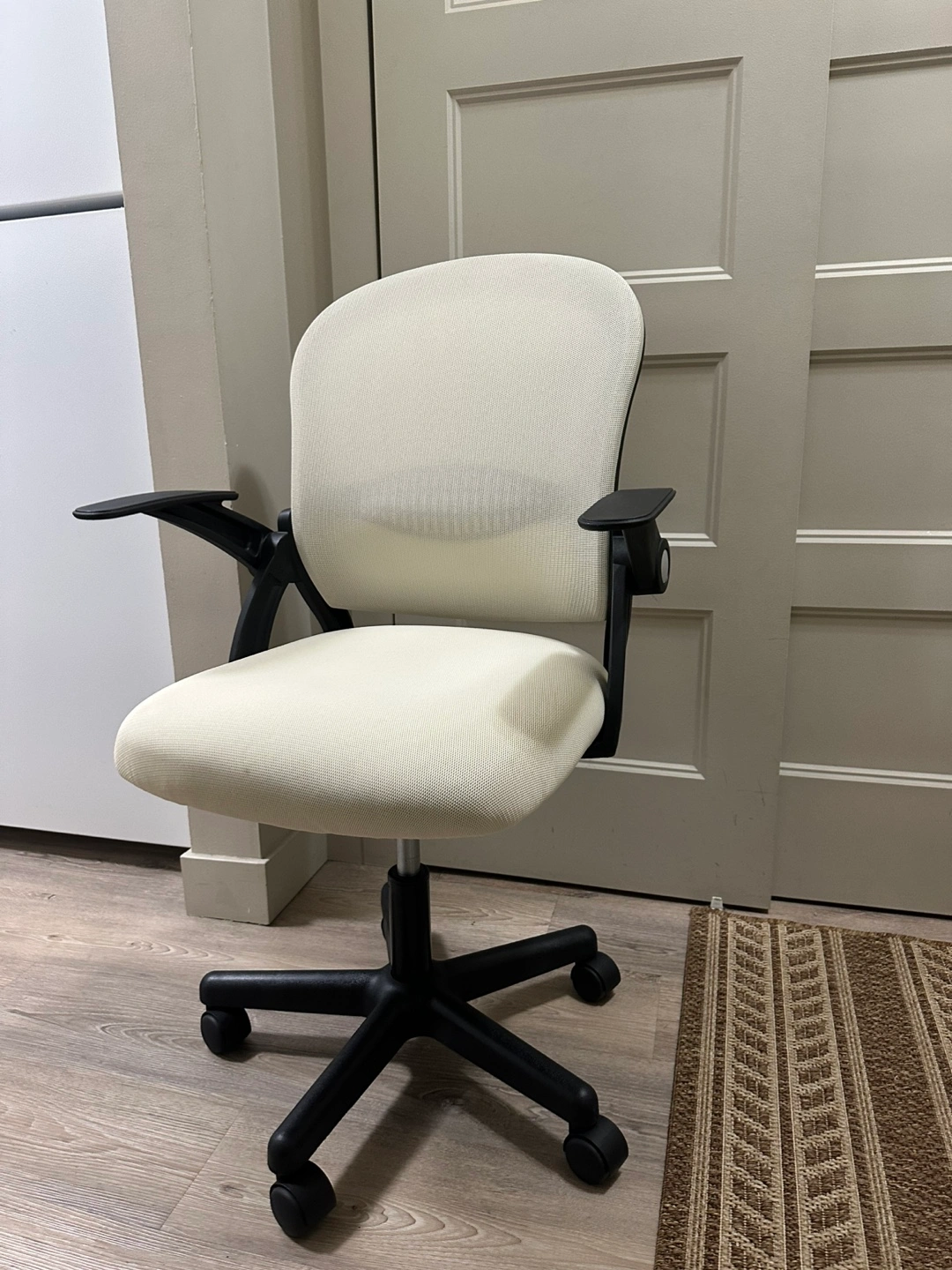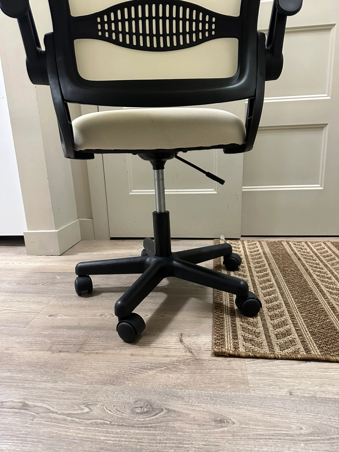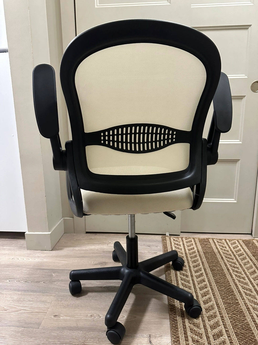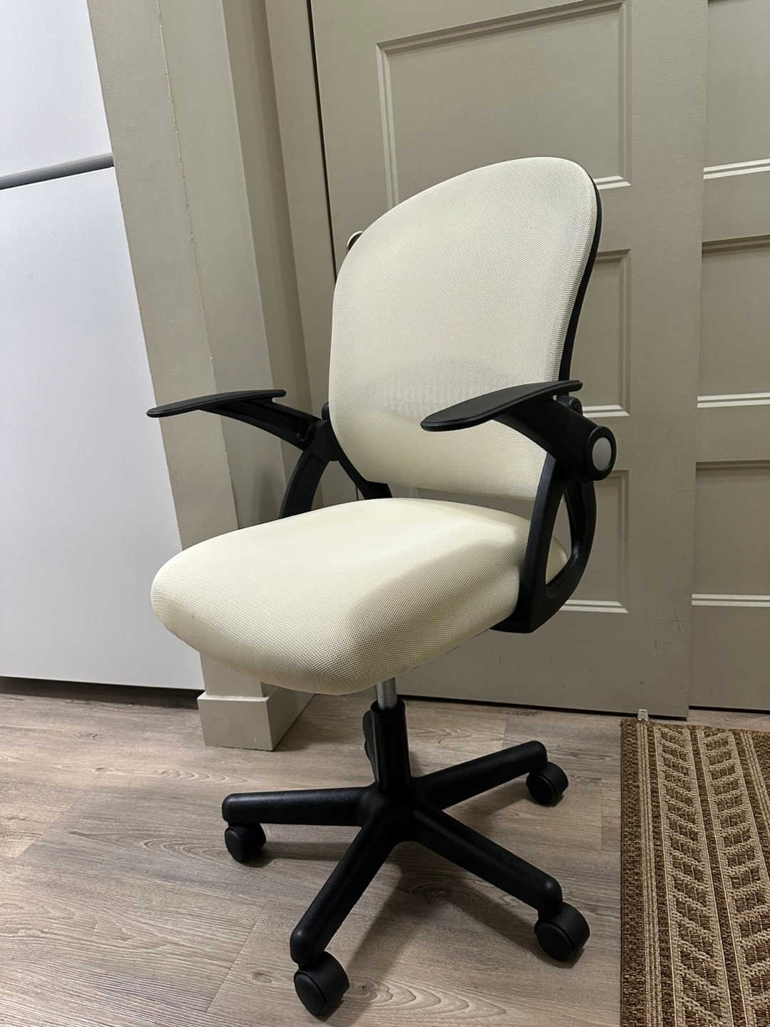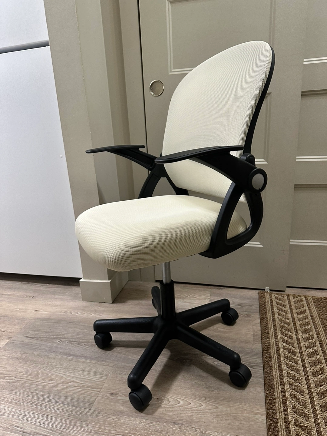 Brand new ergonomic home office swivel desk chair with a breathable mesh back, pneumatic gas-lift height adjustment, 360° rotation, and space-saving flip-up armrests, upholstered in elegant cream fabric. Available for pickup in Red Deer.