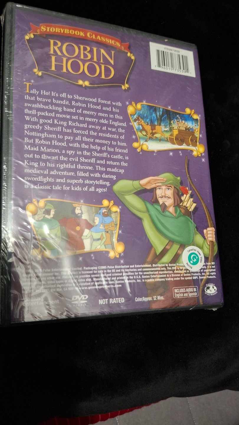 Robin Hood DVD. Classic tale for all ages. Includes audio in Spanish. Approx. 52 minutes. New unopened freecycle