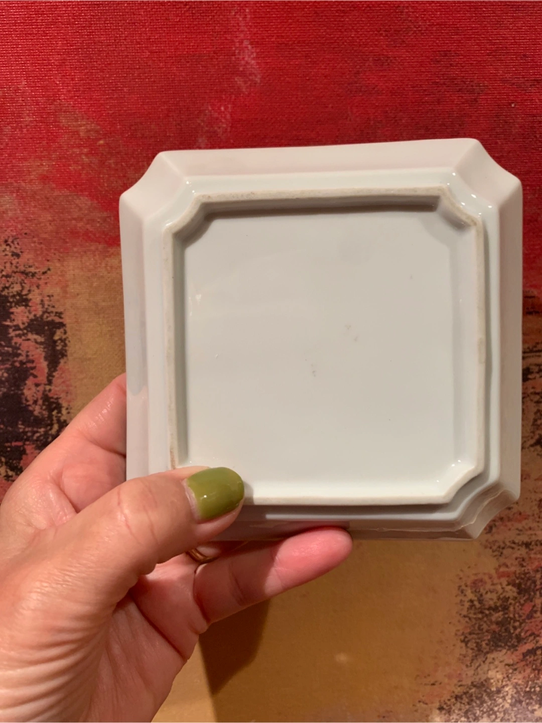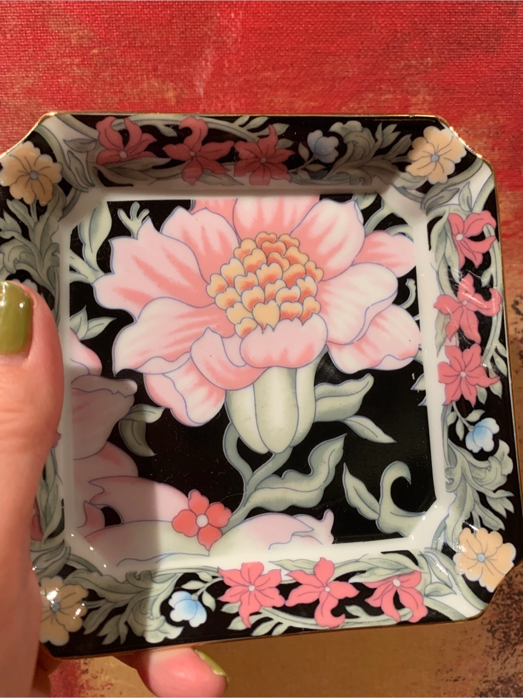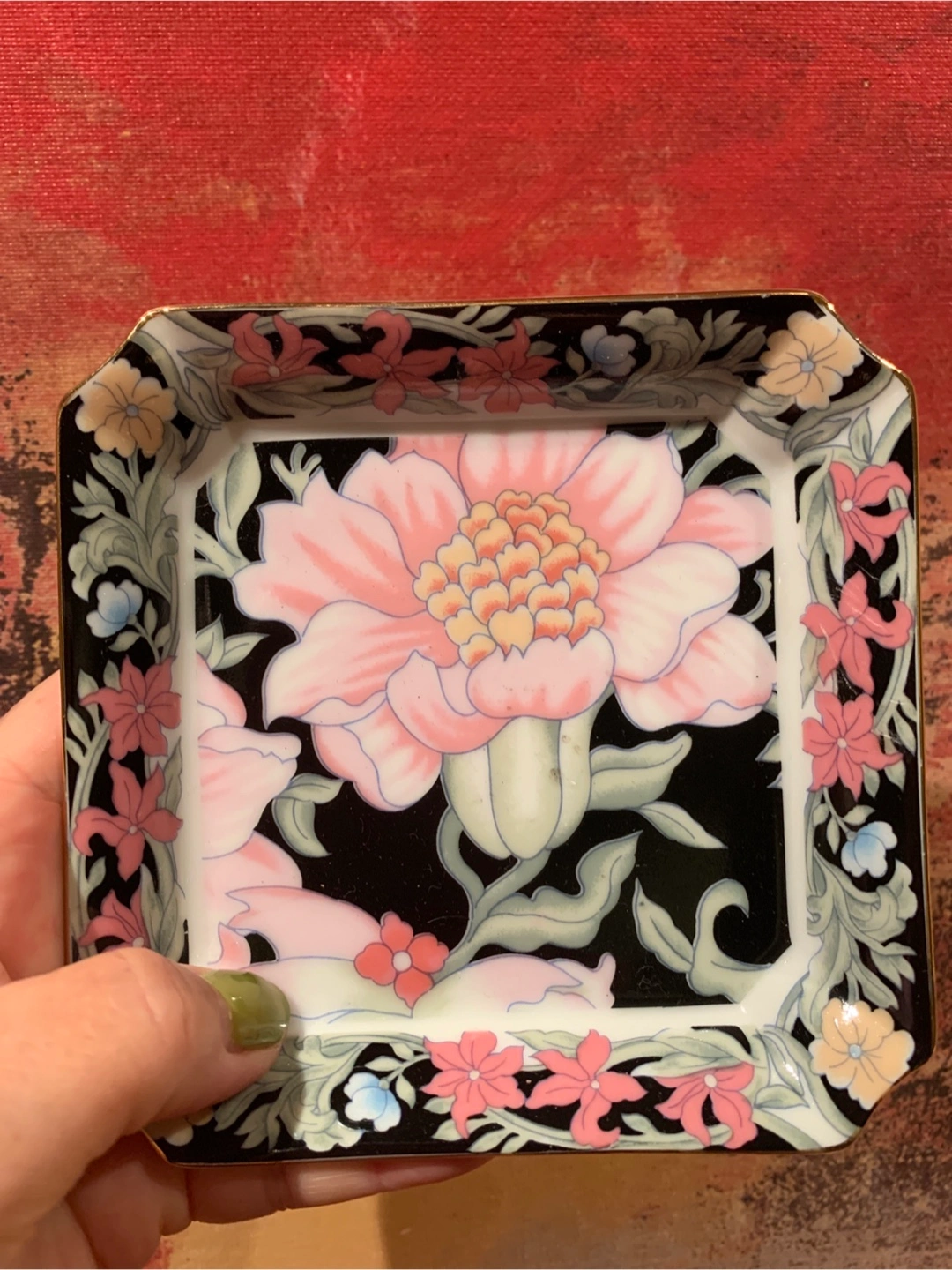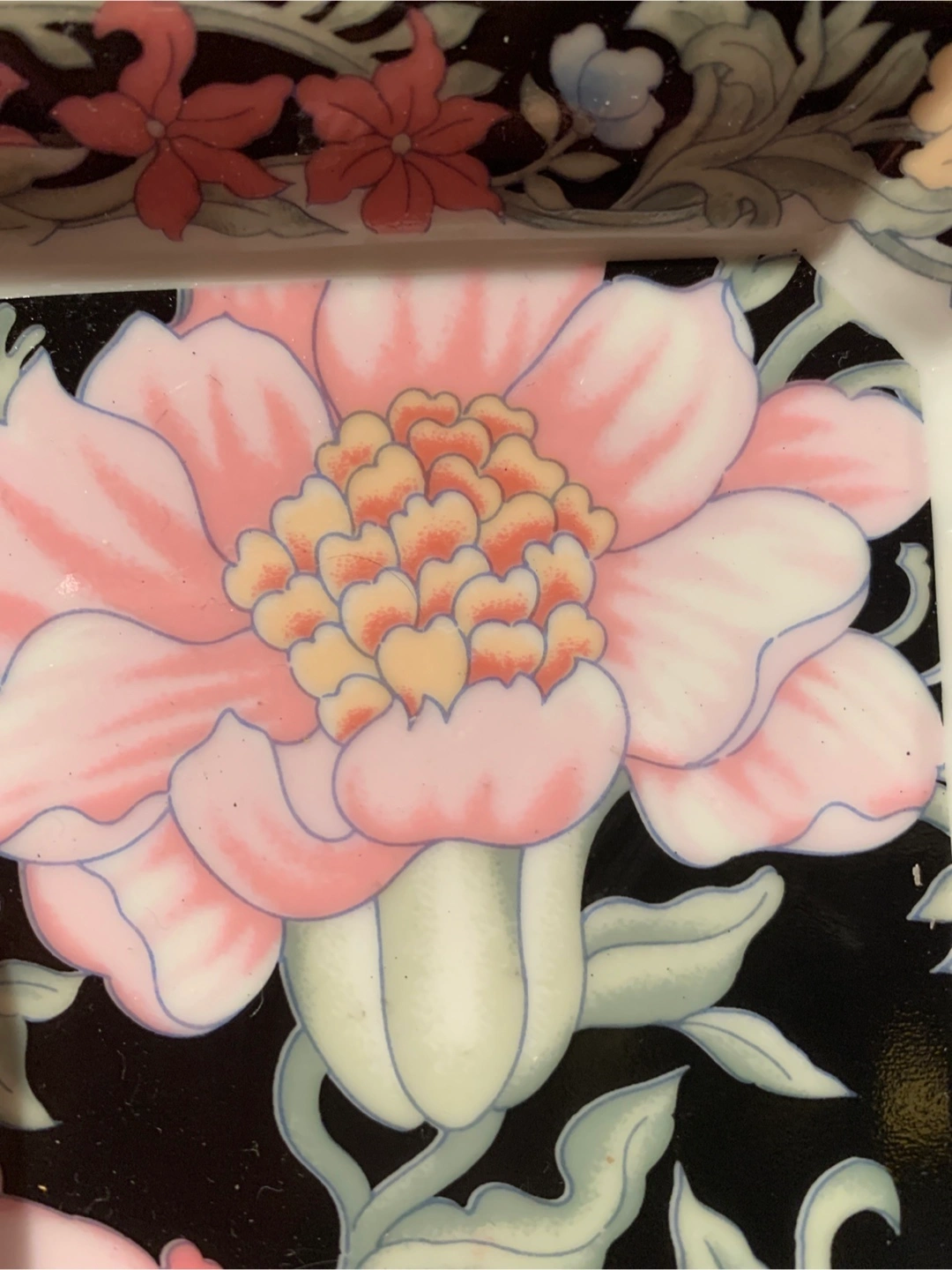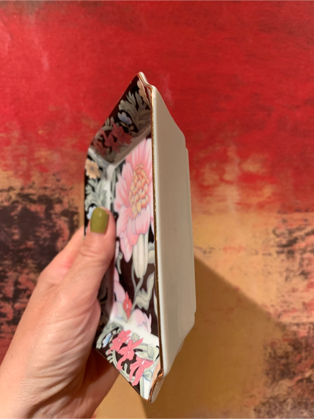 Beautiful Japanese porcelain square trinket dish entitled Garden Pleasures. Features a floral design on a black background. Gold trim around the edges. It measures 5”x 5”. It would be perfect for a tray for jewelry. Very nice floral design! Cash only please.