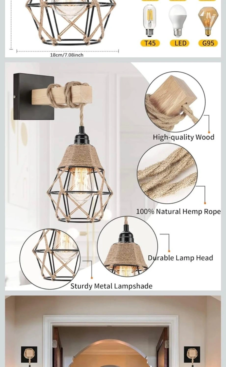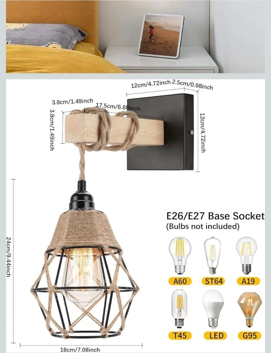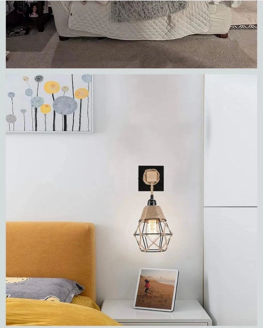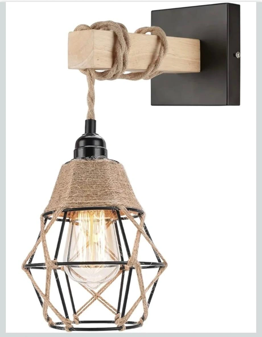 Unique wall-mounted light. Features a geometric metal cage shade wrapped in natural hemp rope. Wooden mount and black metal base. Bulb not included. E26/E27 base socket.