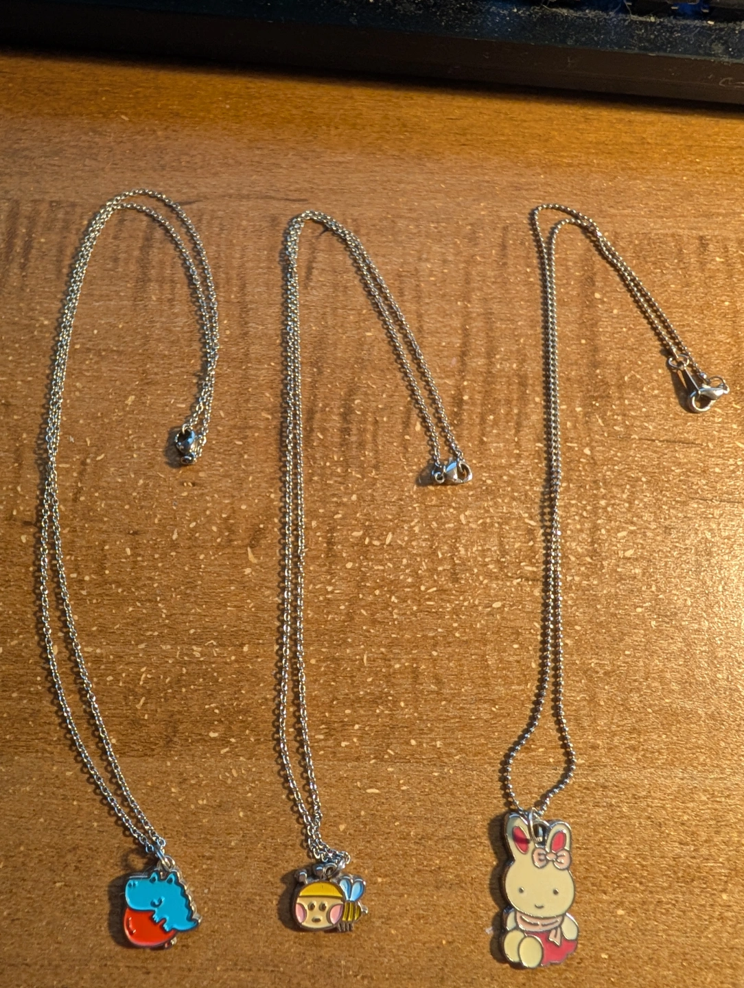 Brand new cartoon Necklaces 5 dollars each 1) dinosaur (from Hong Kong) 2) bumble bee (from Hong Kong) 3) bunny like Miffy (from vendor)