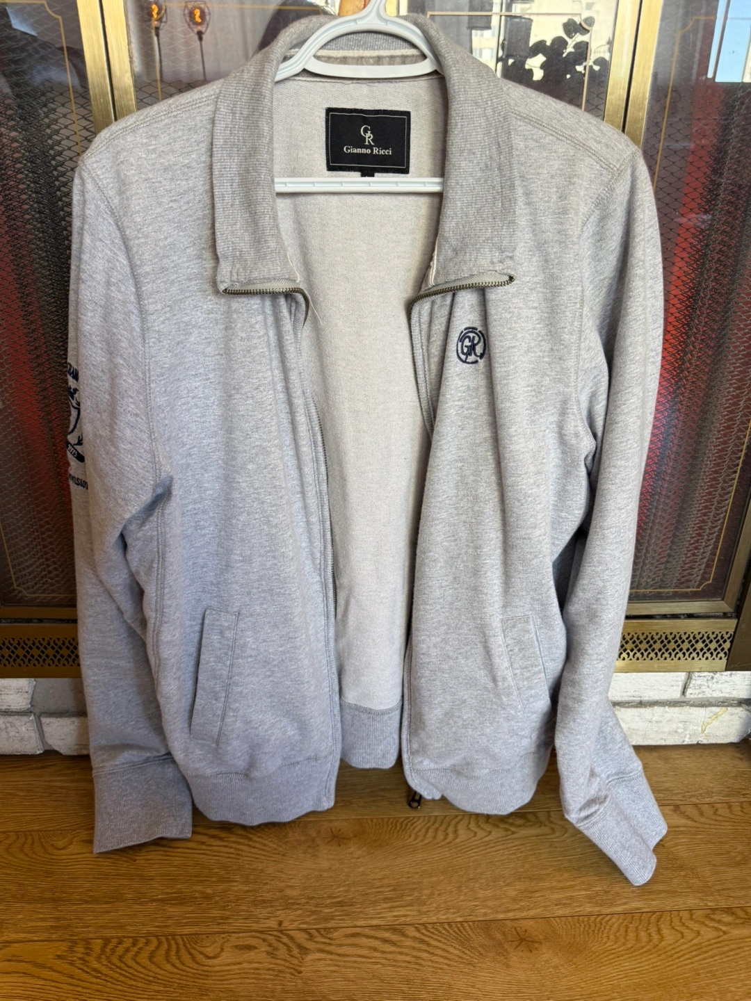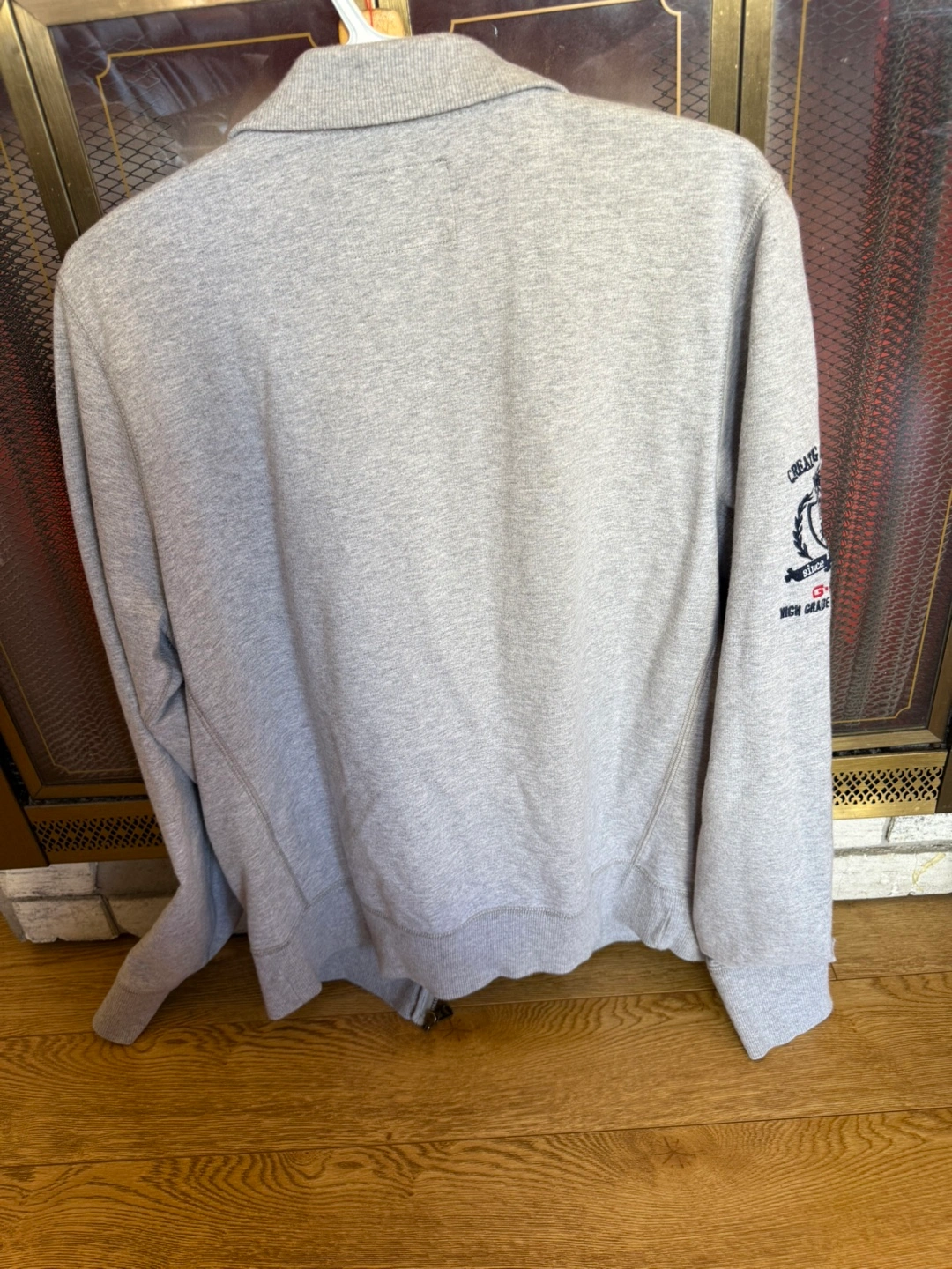 Men's grey zip-up sweater/jacket. Size large. Features embroidered logo on sleeve and chest. Perfect condition. Great for spring weather or for layering up.