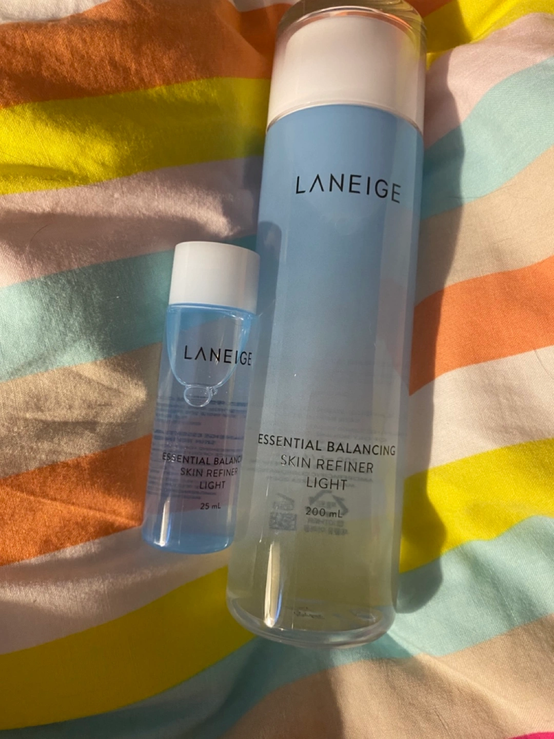 LANEIGE Essential Balancing Skin Refiner Light. Set includes a full-size 200 mL bottle and travel-size 25 mL bottle. Great for hydrating and balancing skin.